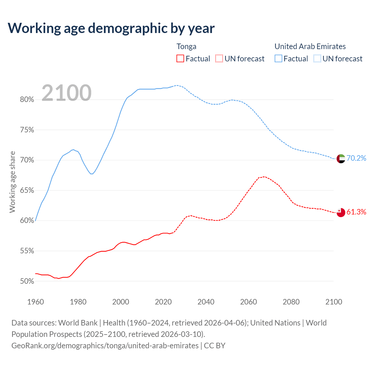 - Tonga has 59.8K working age adults (aged 15-64) vs 9.6M in the United Arab Emirates.