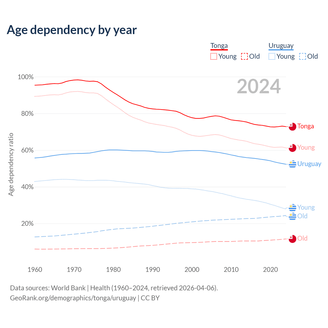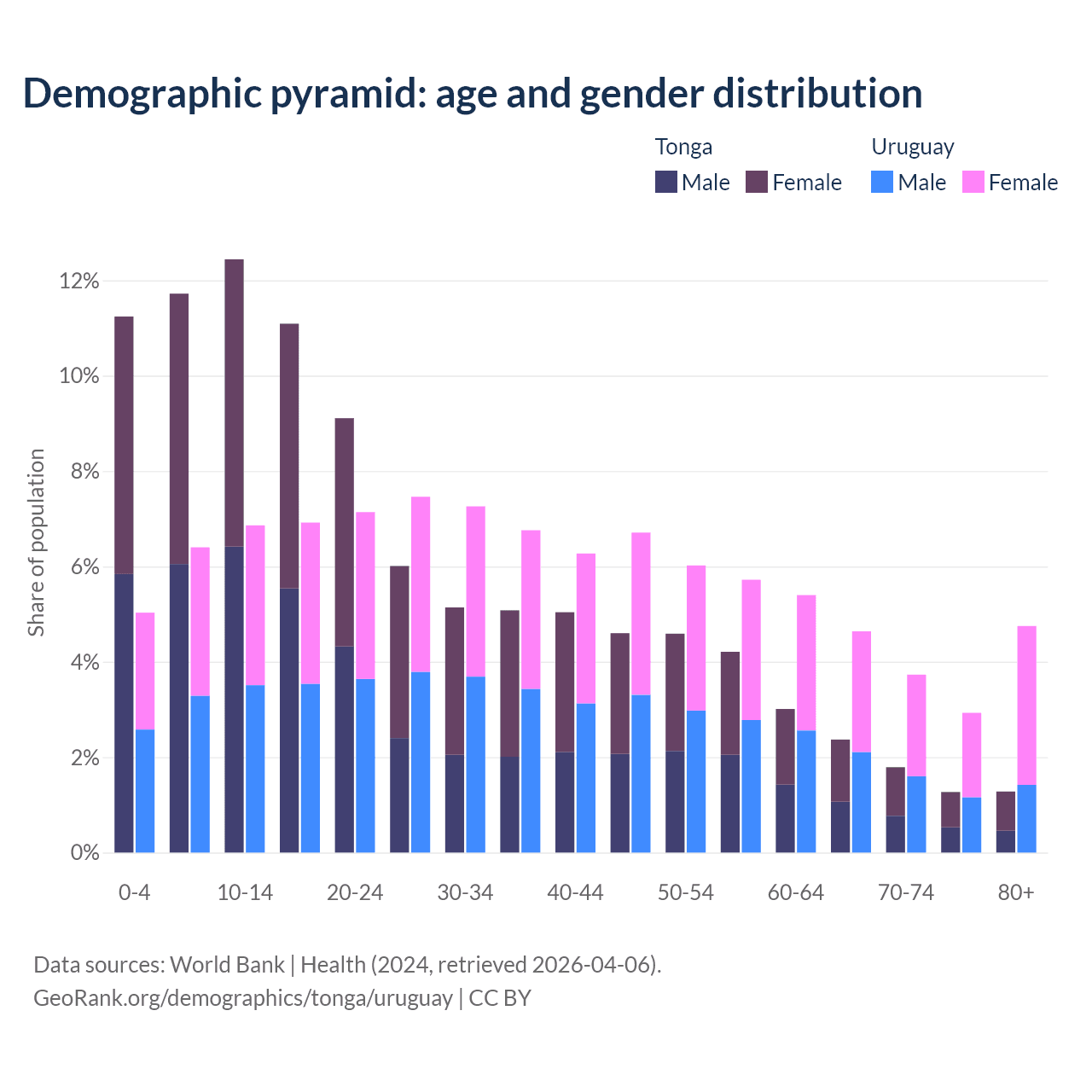- Tonga is ranked 149/196 by median age (oldest to youngest) vs 63/196 for Uruguay.