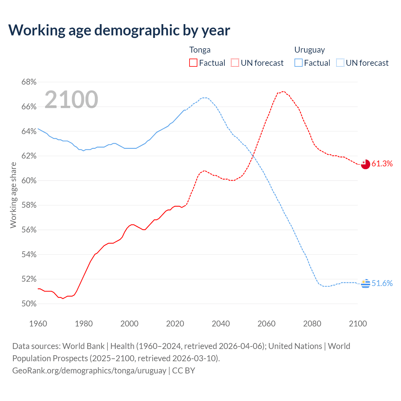 - Tonga has 59.8K working age adults (aged 15-64) vs 2.22M in Uruguay.