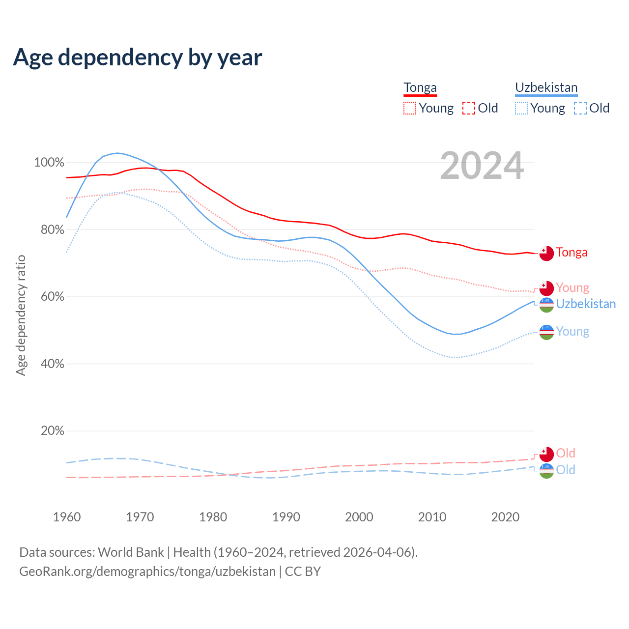 Data sources: World Bank | Health (1960–2024, retrieved 2026-04-06); U.S. Census Bureau (1960–2024, retrieved 2026-02-08).