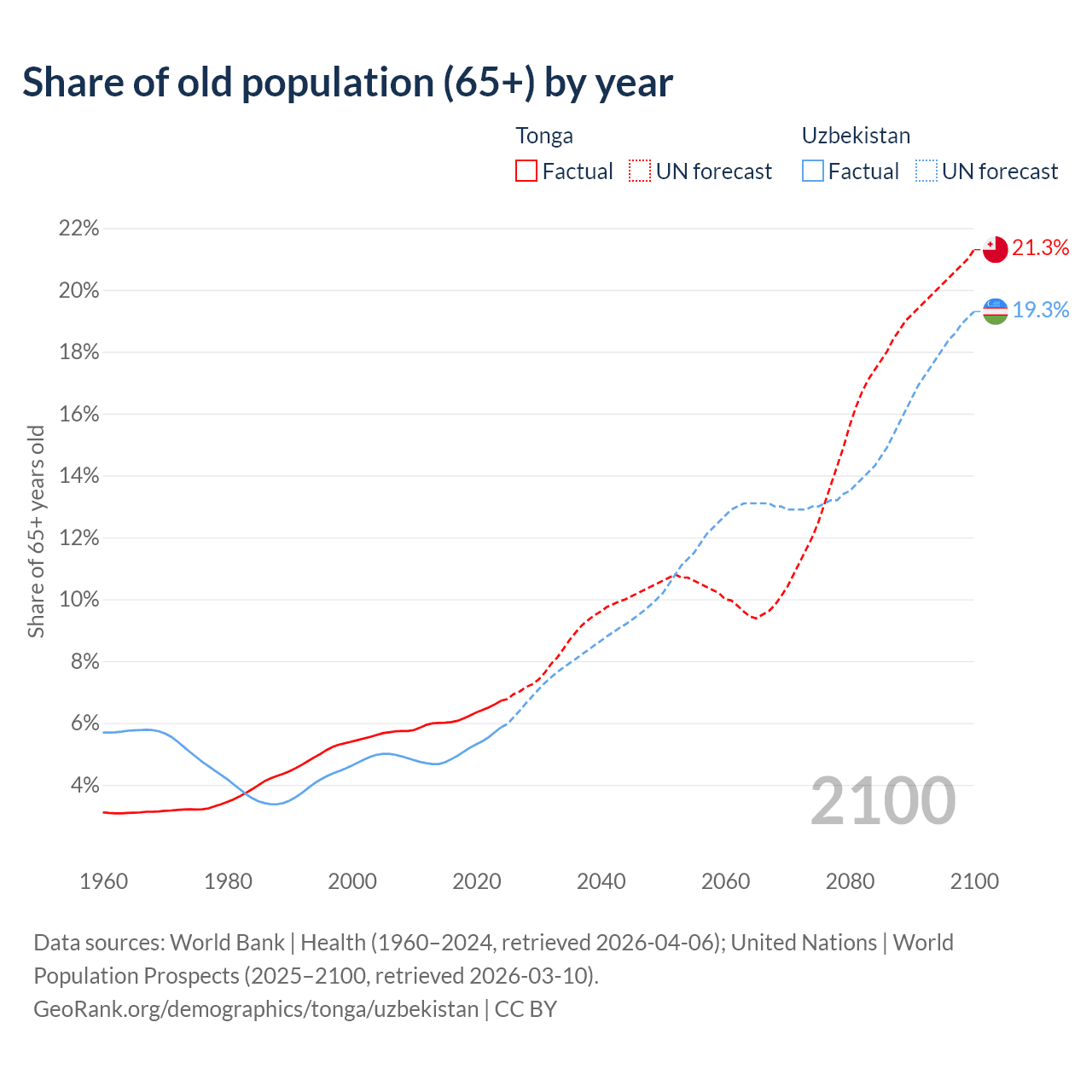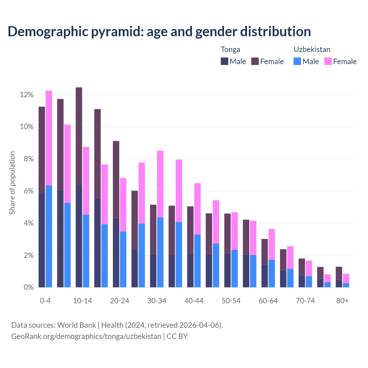 - The share of old-age demographic (65+) in Tonga is 6.72% vs 5.86% in Uzbekistan.