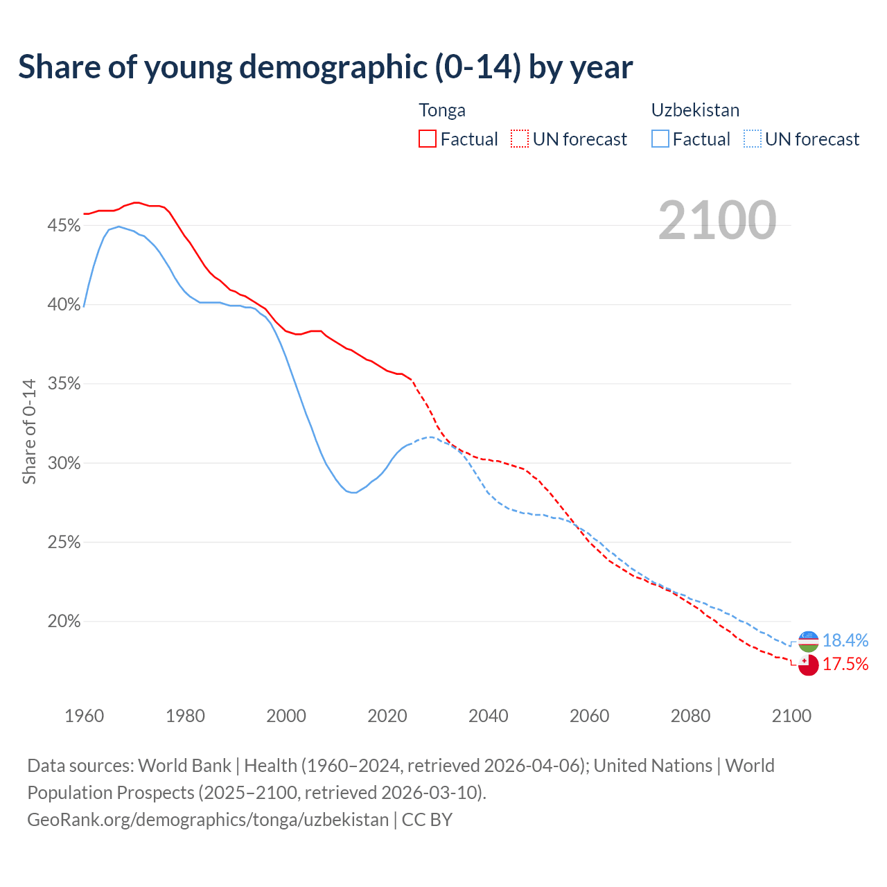 - The share of young demographic (0-15 years old) in Tonga is 35.4% vs 31.1% in Uzbekistan.