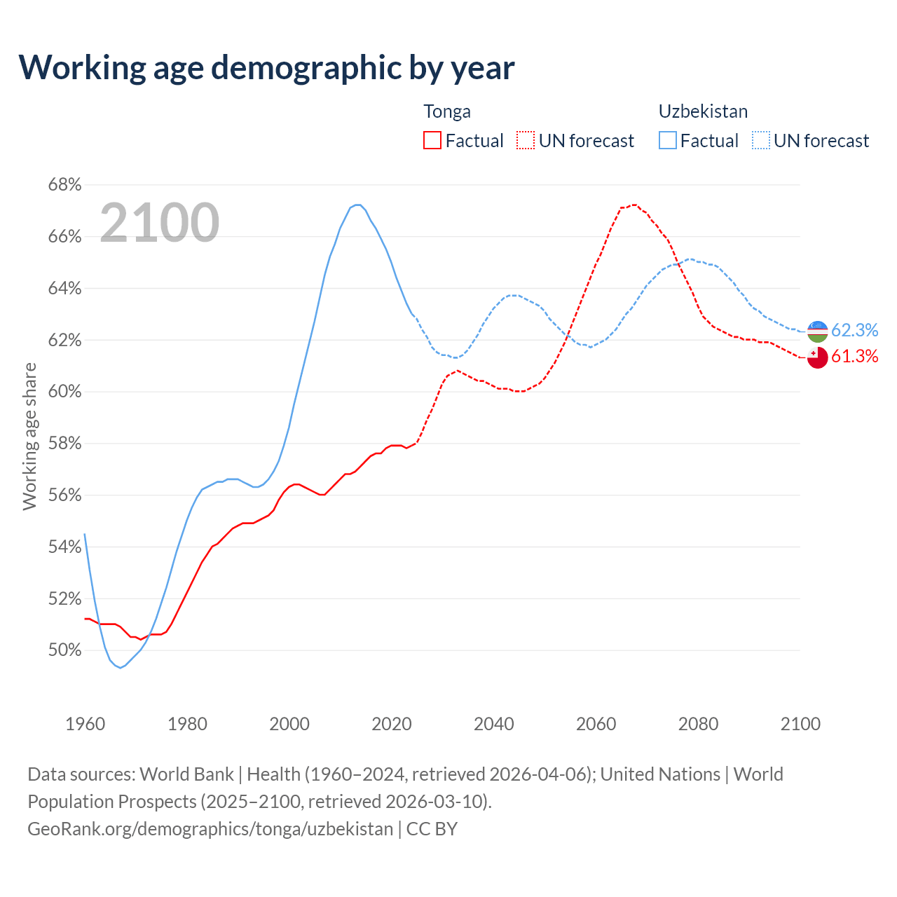 Median age Tonga vs Uzbekistan, 1960-2100