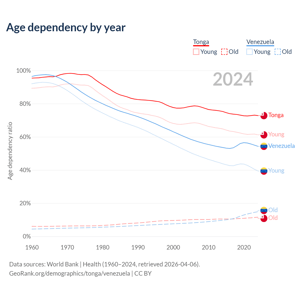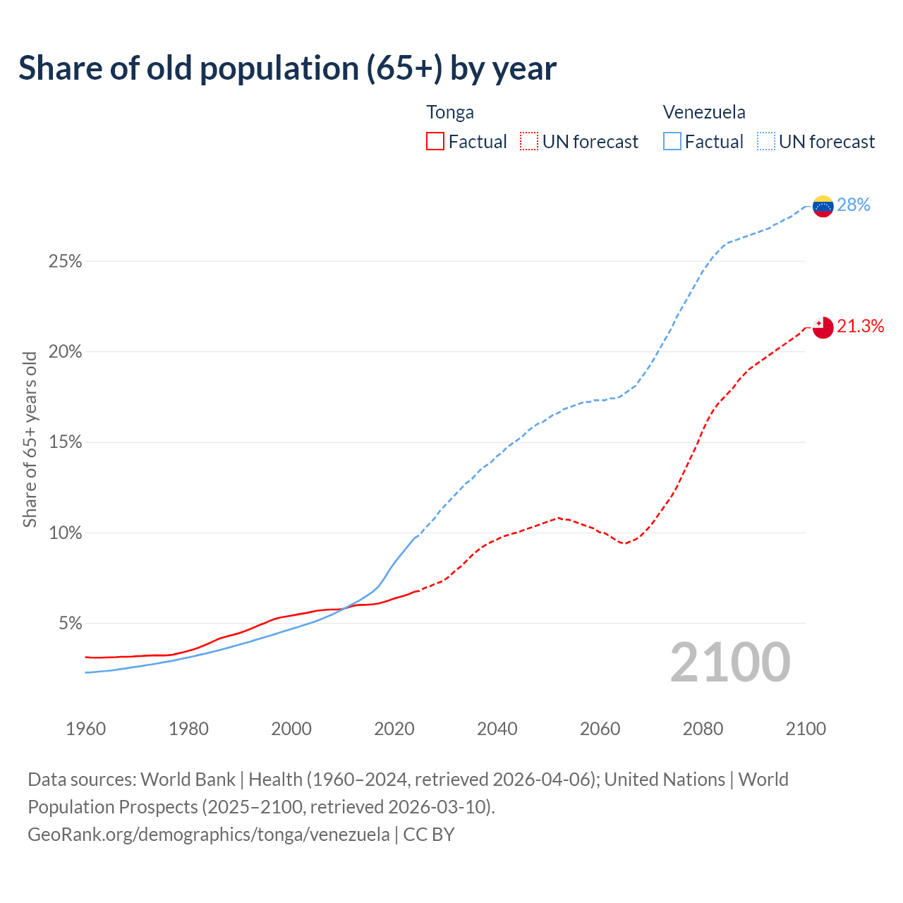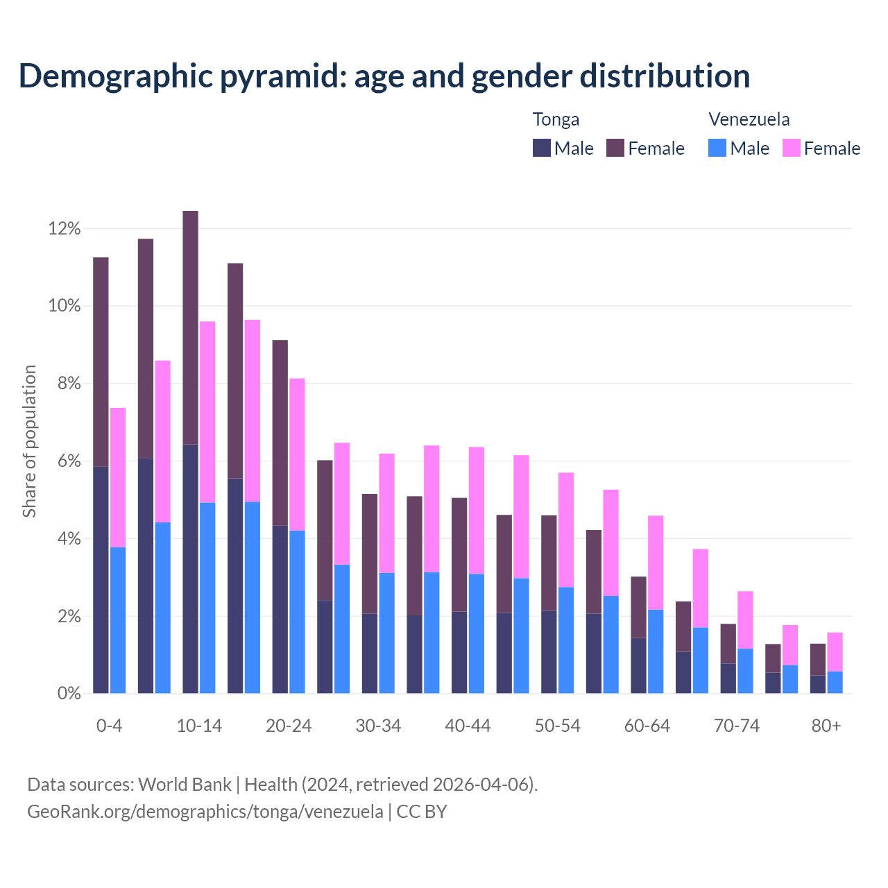 - The share of old-age demographic (65+) in Tonga is 6.72% vs 9.68% in Venezuela.