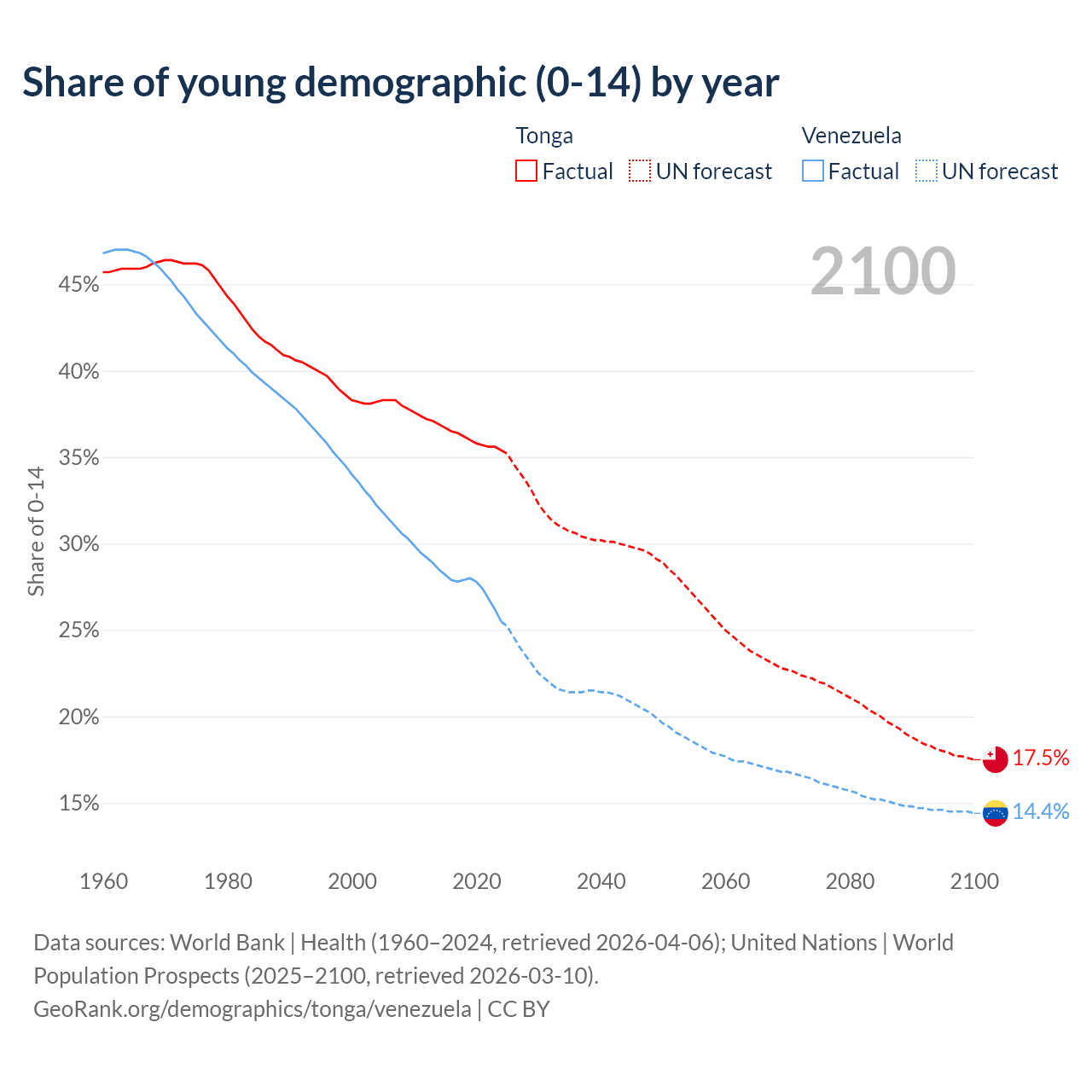 - The share of young demographic (0-15 years old) in Tonga is 35.4% vs 25.5% in Venezuela.