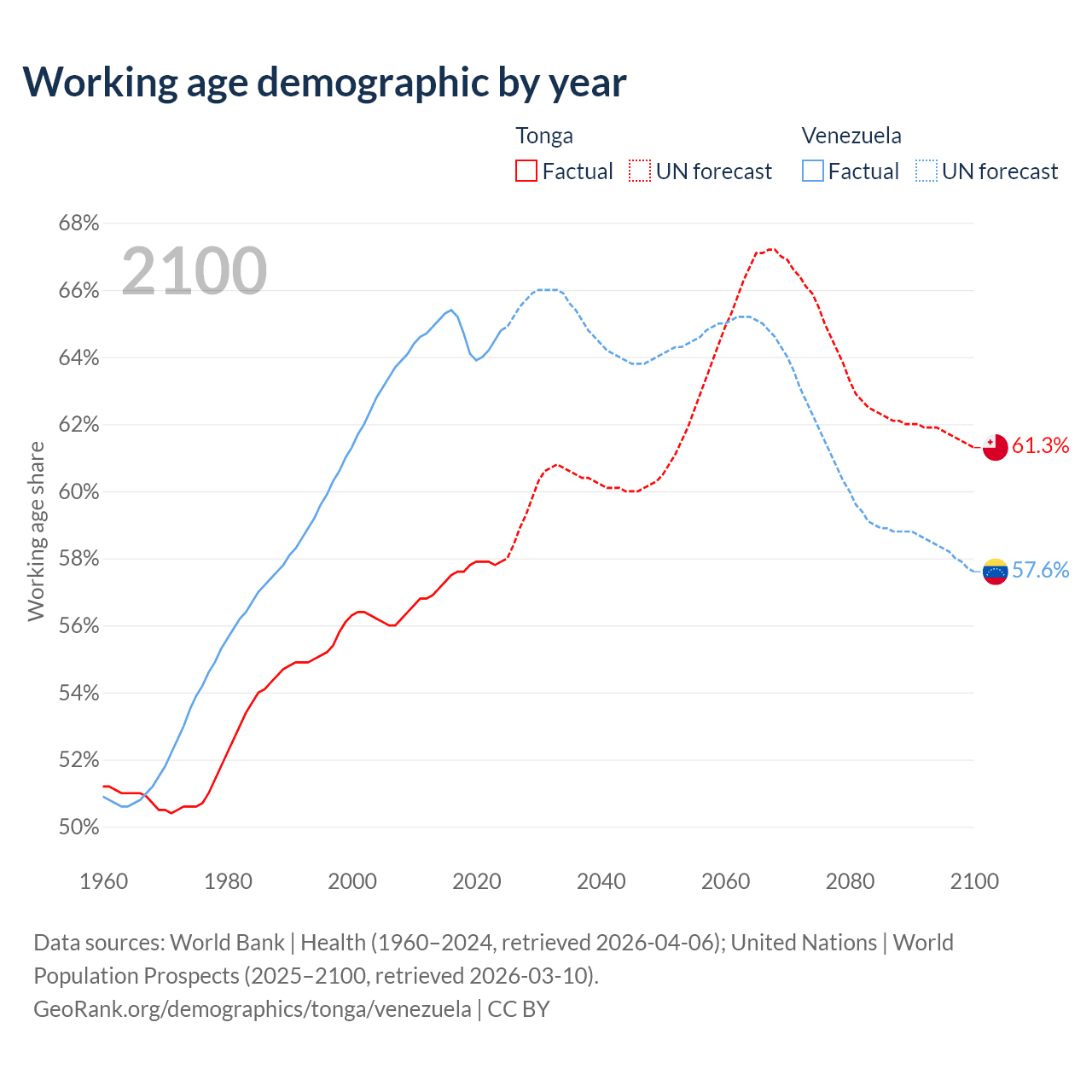 - Tonga has 59.8K working age adults (aged 15-64) vs 18.6M in Venezuela.
