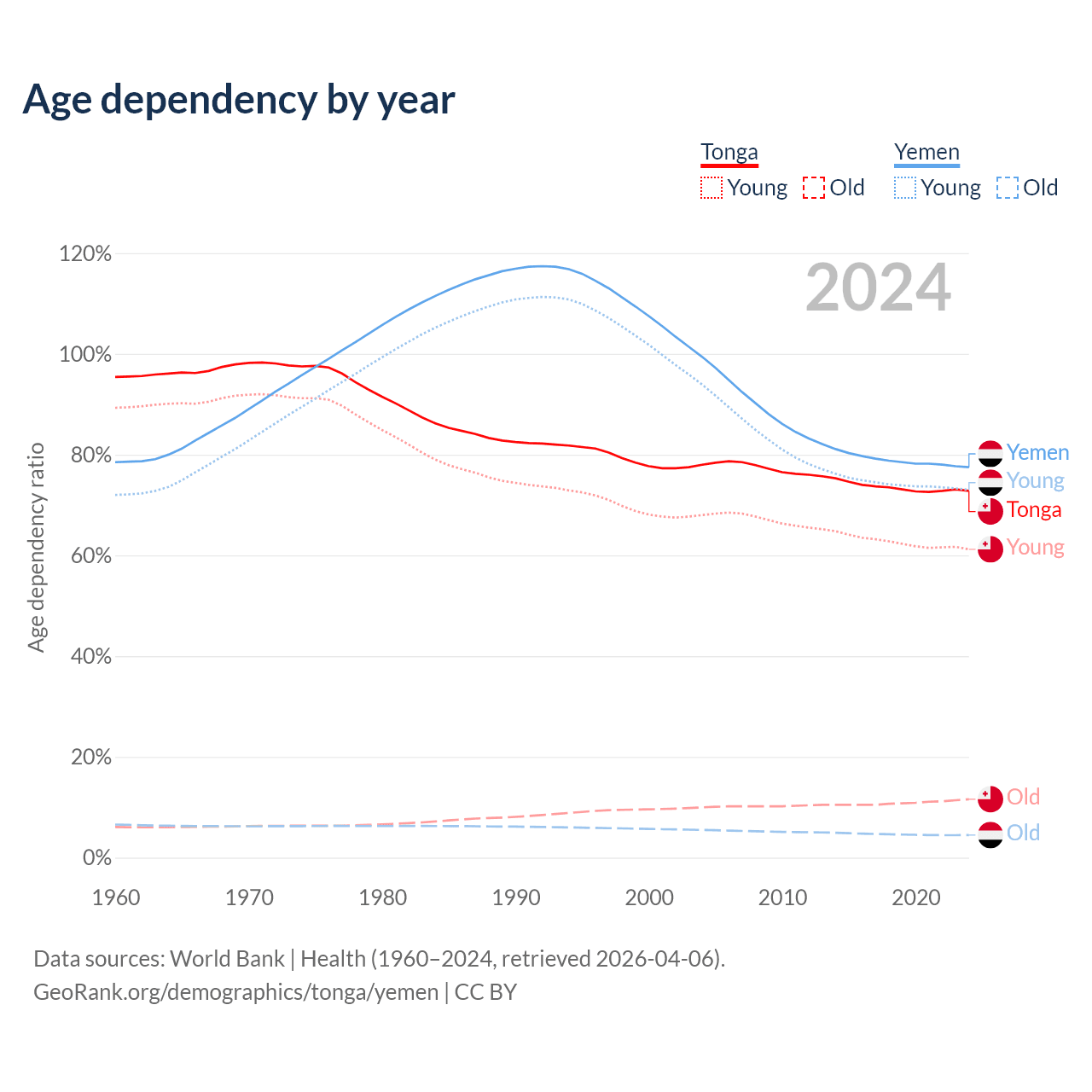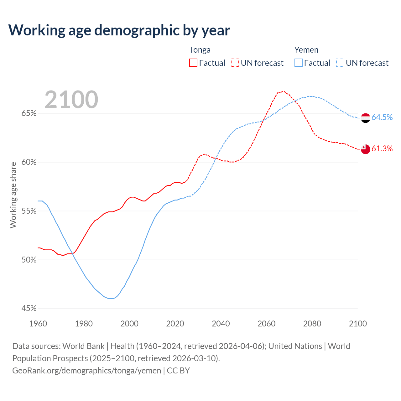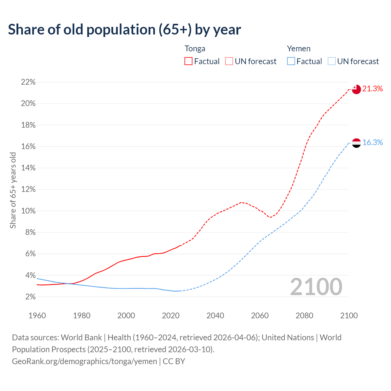- The share of old-age demographic (65+) in Tonga is 6.72% vs 2.52% in Yemen.