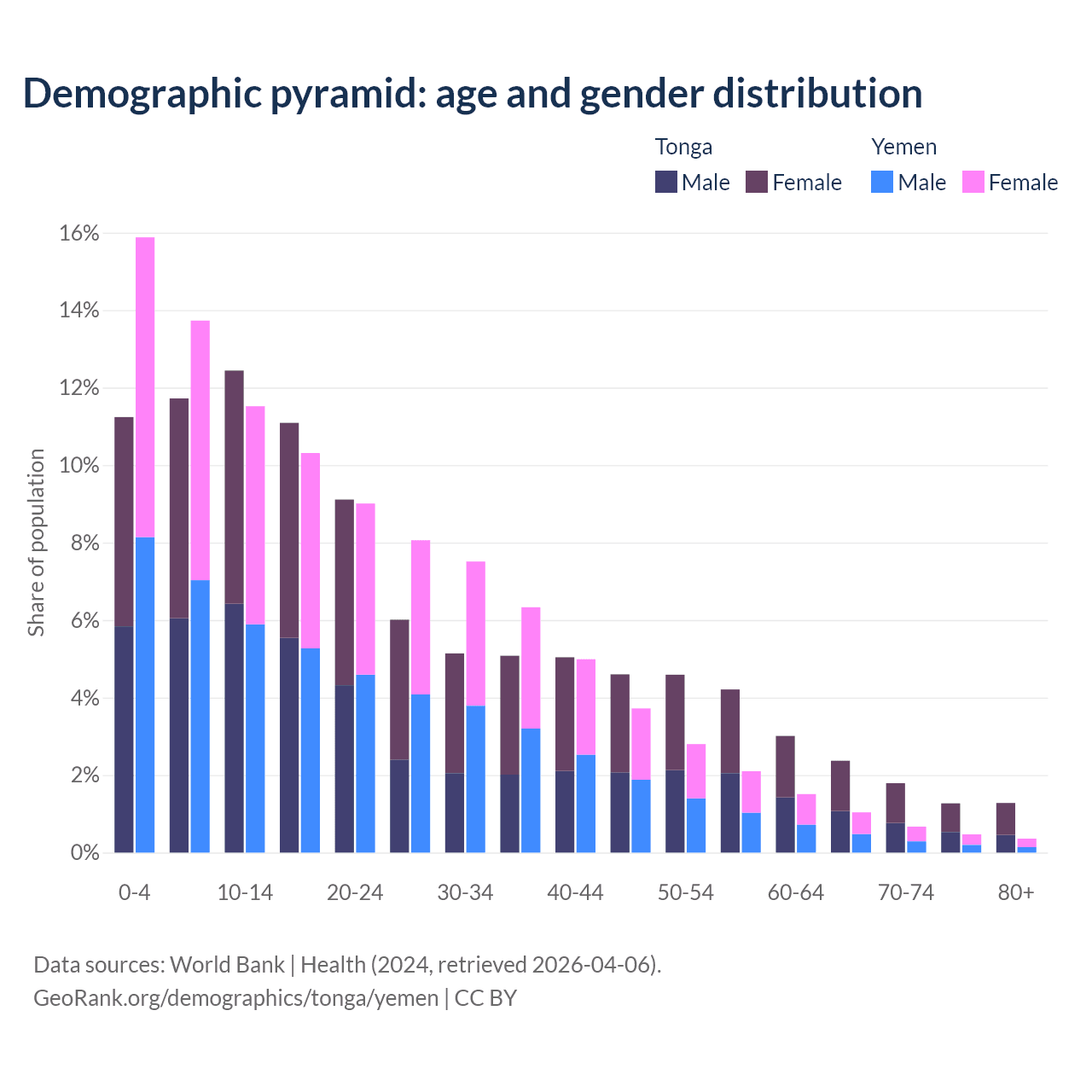 - Tonga is ranked 149/196 by median age (oldest to youngest) vs 174/196 for Yemen.