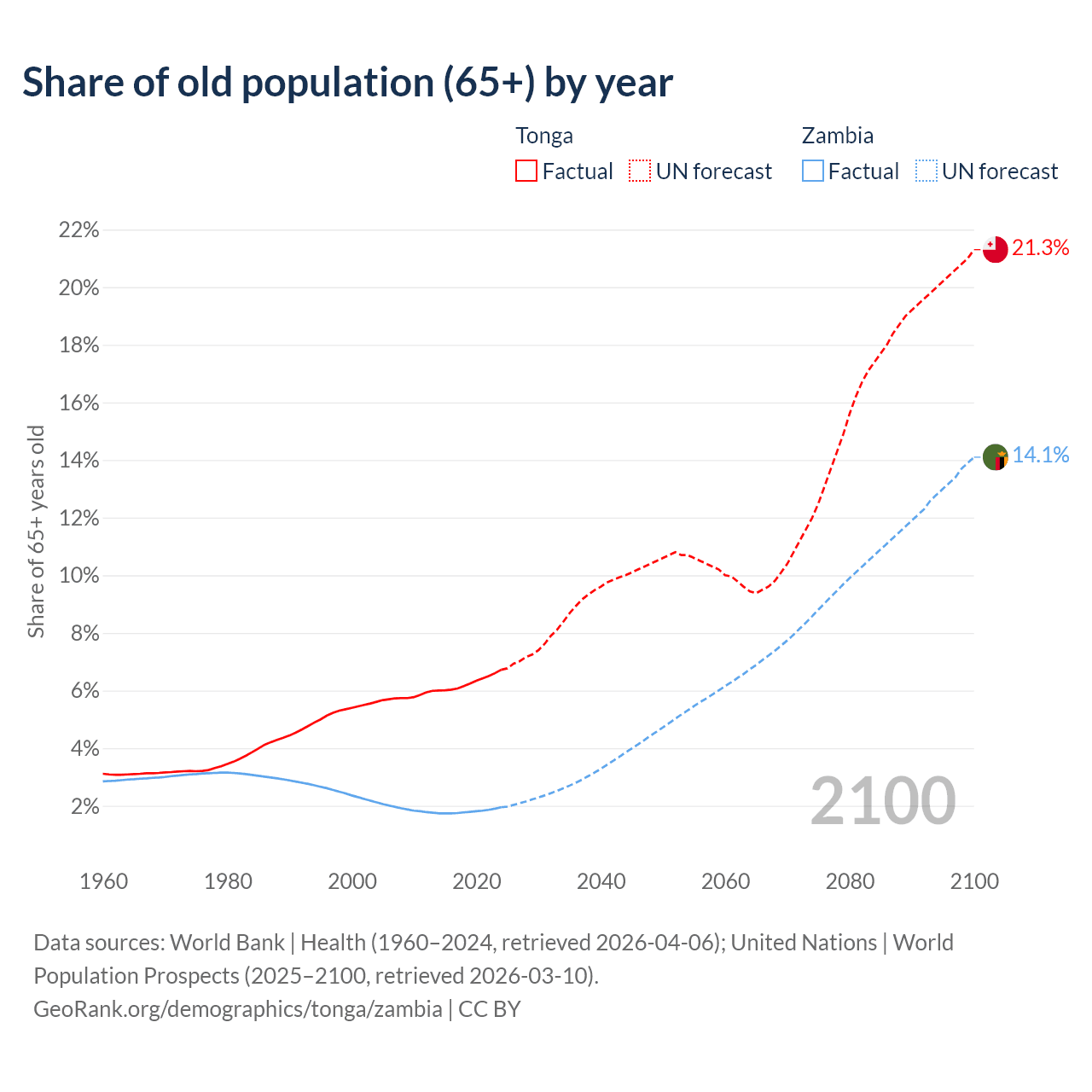 - The share of old-age demographic (65+) in Tonga is 6.72% vs 1.95% in Zambia.