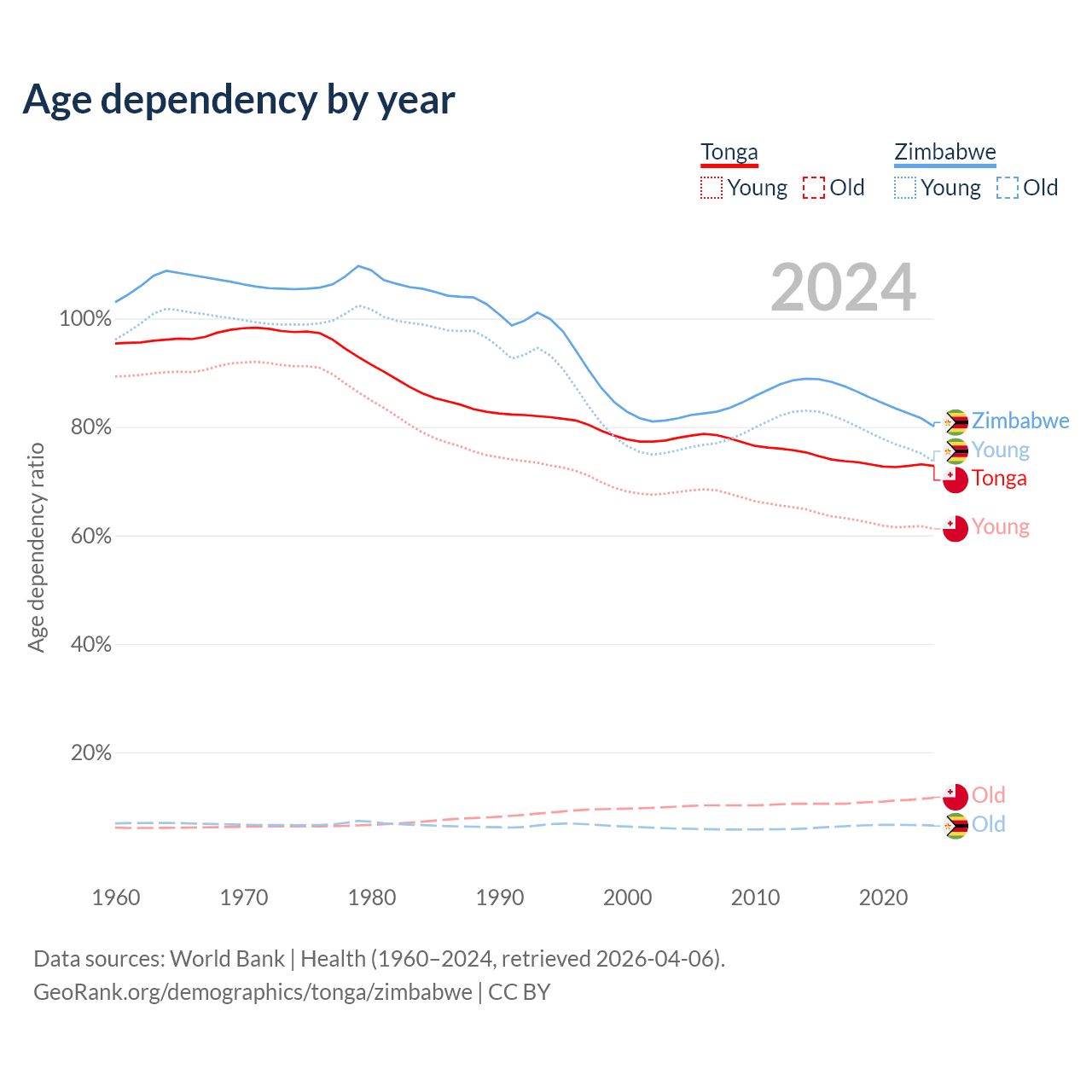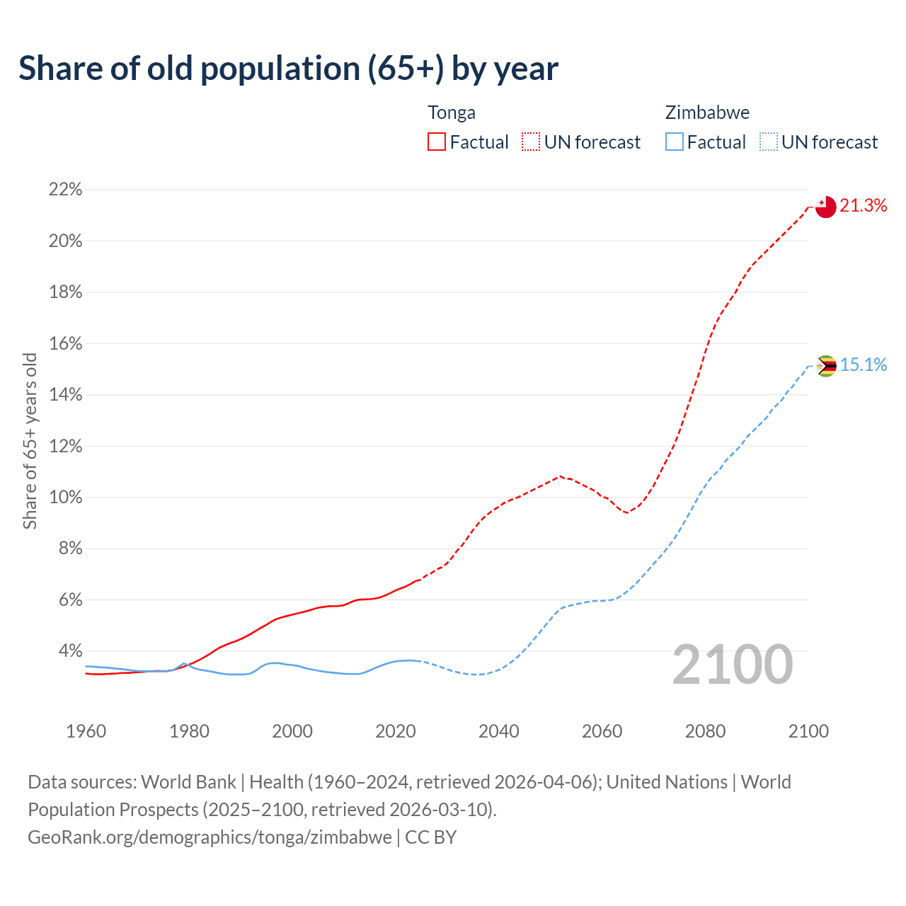 - The share of old-age demographic (65+) in Tonga is 6.72% vs 3.6% in Zimbabwe.