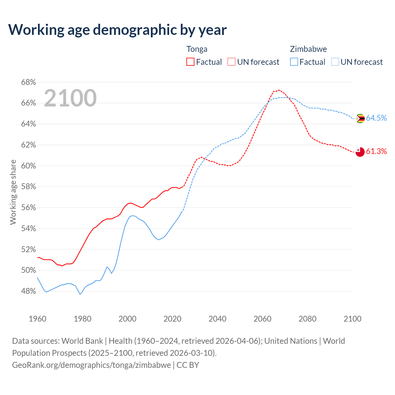 - Tonga has 59.8K working age adults (aged 15-64) vs 9.64M in Zimbabwe.