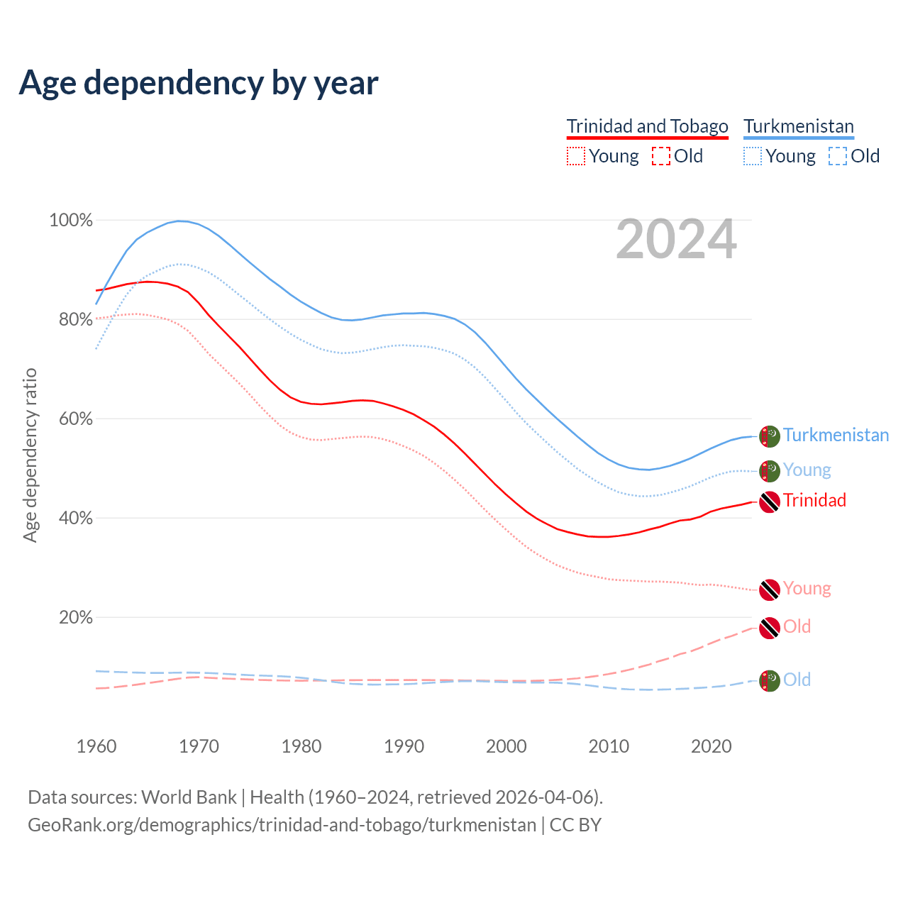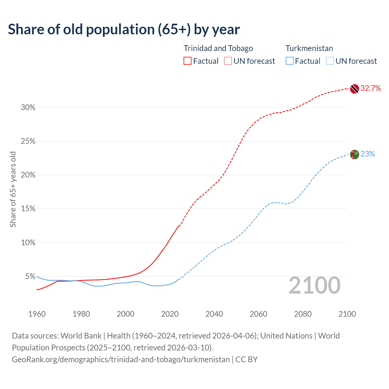 - The share of old-age demographic (65+) in Trinidad and Tobago is 12.4% vs 4.53% in Turkmenistan.