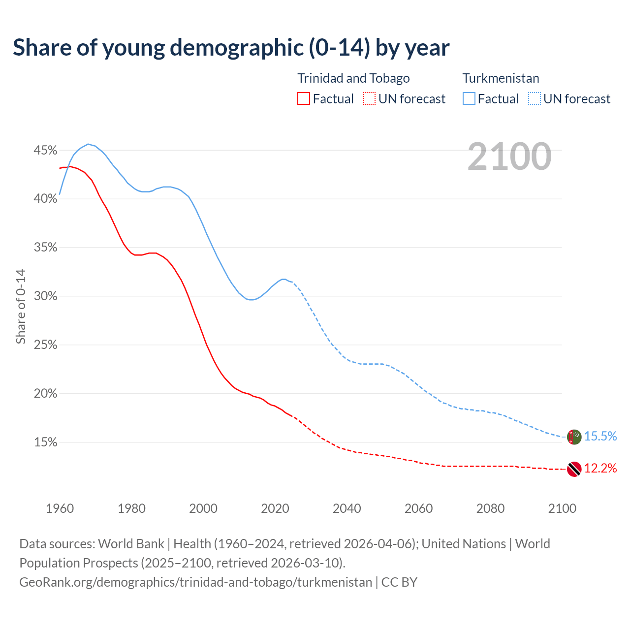 - The share of young demographic (0-15 years old) in Trinidad and Tobago is 17.8% vs 31.5% in Turkmenistan.