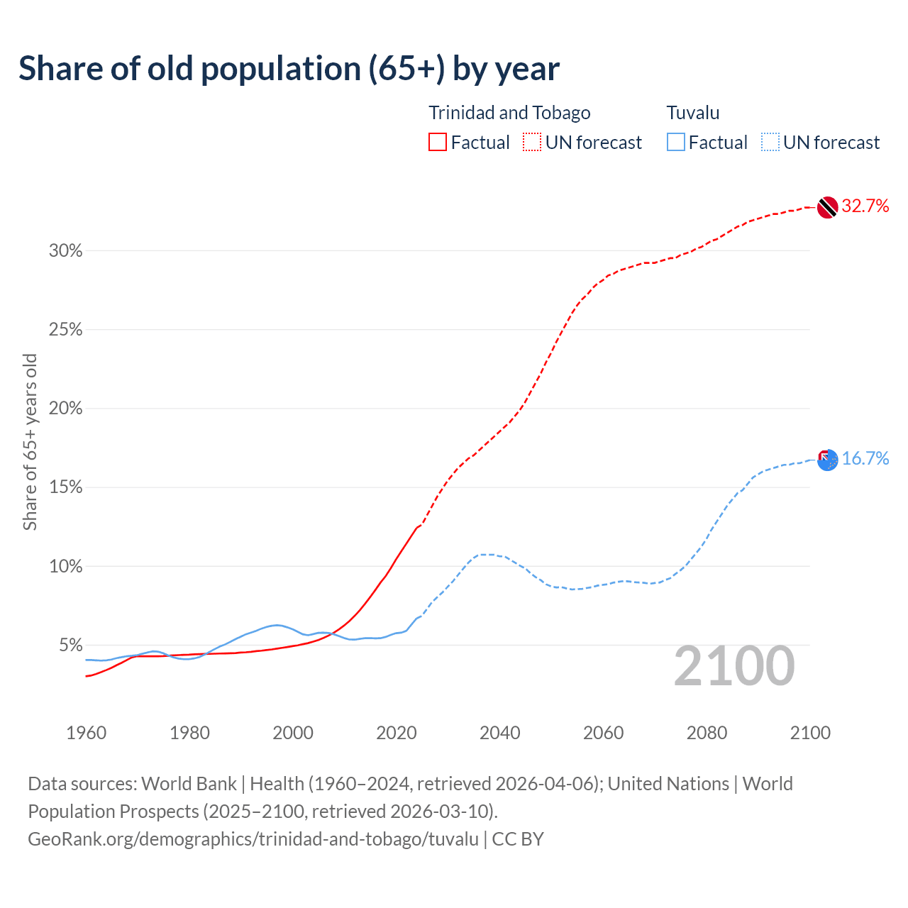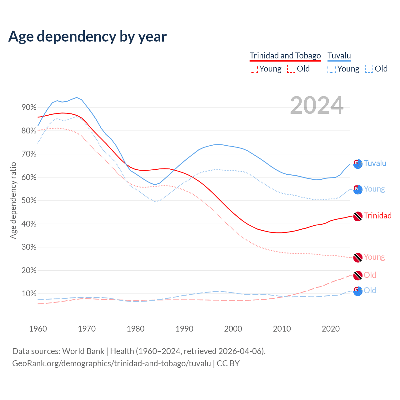 - The share of old-age demographic (65+) in Trinidad and Tobago is 12.4% vs 6.67% in Tuvalu.