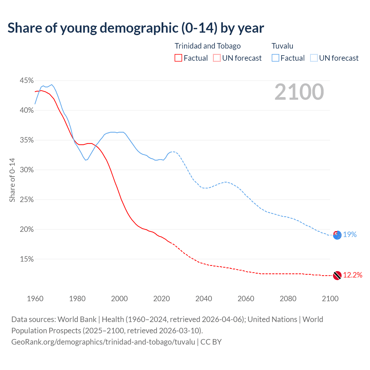 - The share of young demographic (0-15 years old) in Trinidad and Tobago is 17.8% vs 32.9% in Tuvalu.