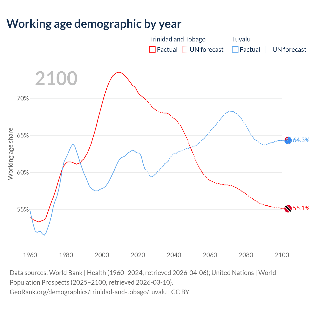 The share of older people aged 65 and over is 12.4% in Trinidad and Tobago and 6.67% in Tuvalu. Life expectancy in Trinidad and Tobago compared to Tuvalu .