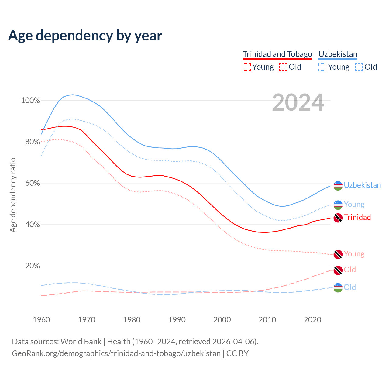 Data sources: World Bank | Health (1960–2024, retrieved 2026-04-06); U.S. Census Bureau (1960–2024, retrieved 2026-02-08).