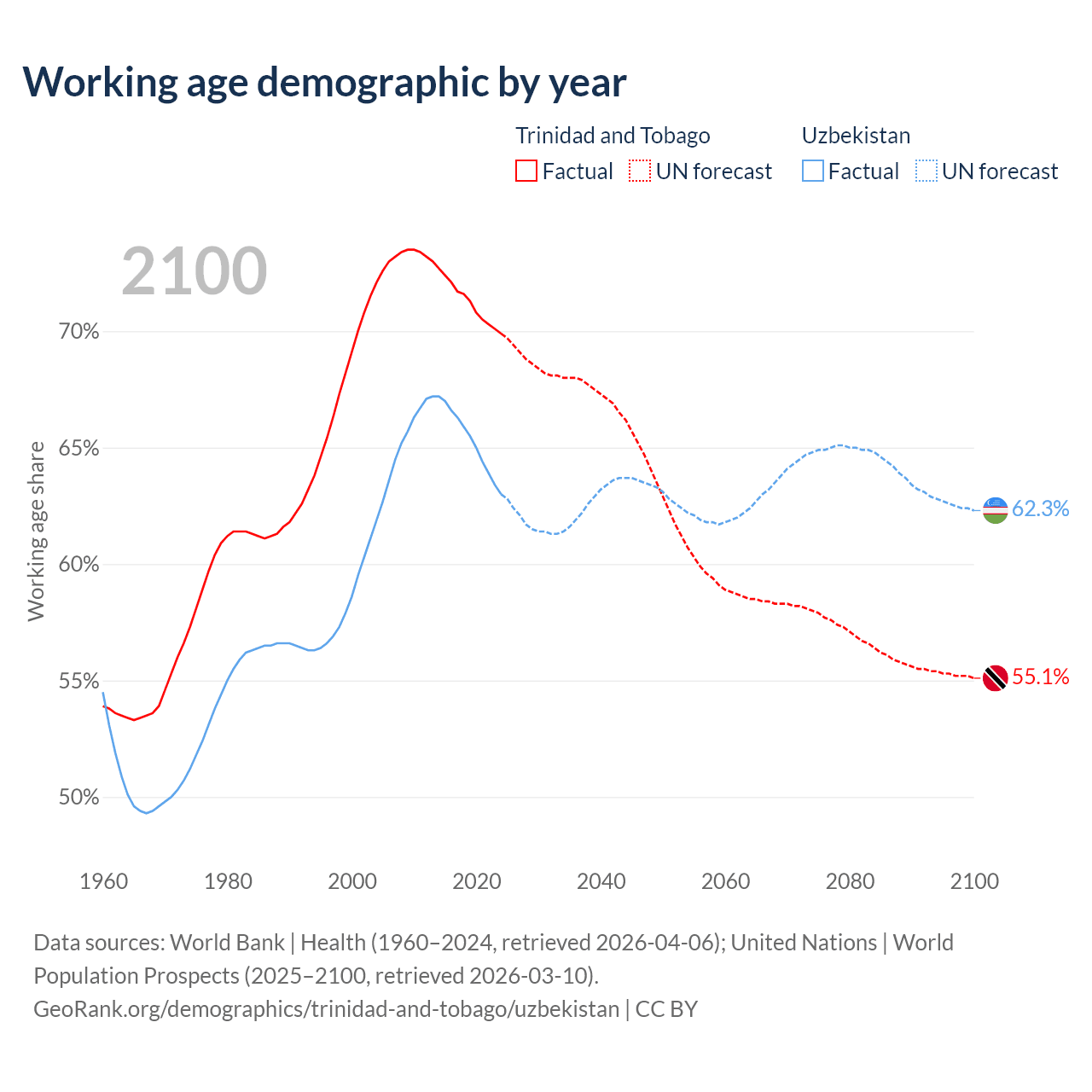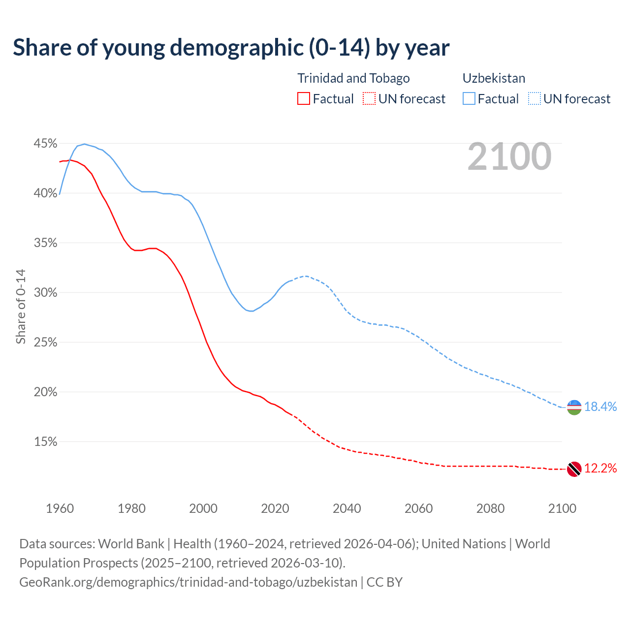 - The share of young demographic (0-15 years old) in Trinidad and Tobago is 17.8% vs 31.1% in Uzbekistan.