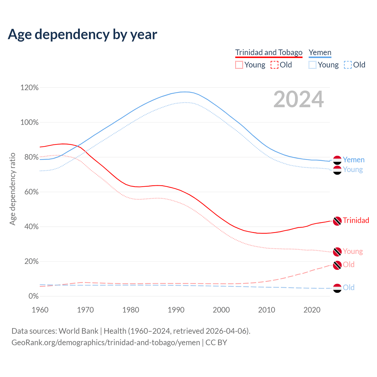 - The share of old-age demographic (65+) in Trinidad and Tobago is 12.4% vs 2.52% in Yemen.