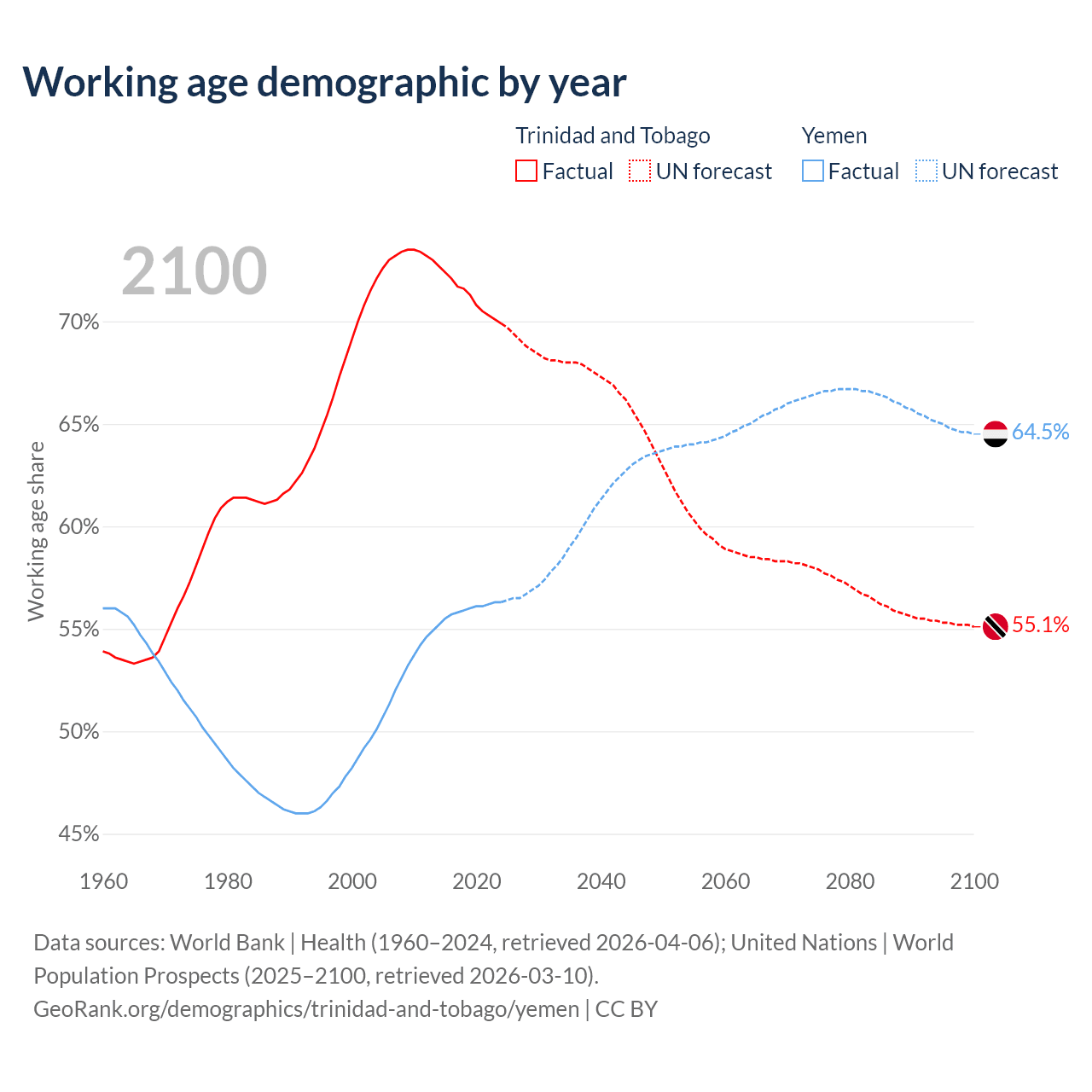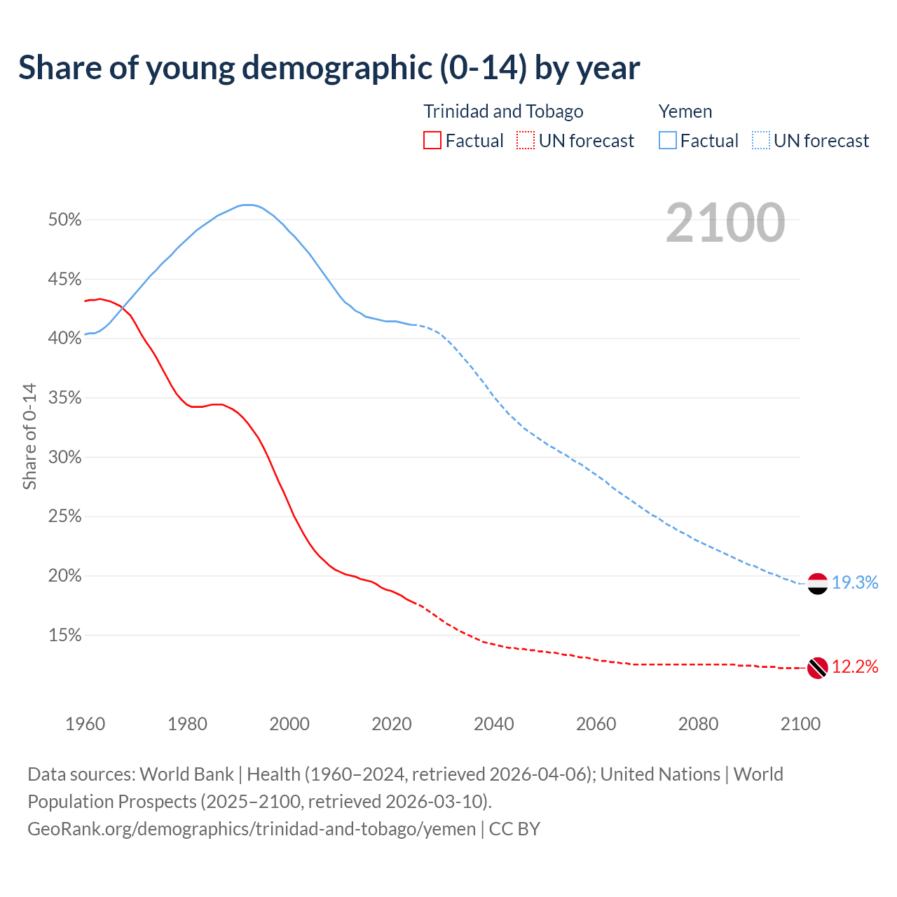 - The share of young demographic (0-15 years old) in Trinidad and Tobago is 17.8% vs 41.1% in Yemen.