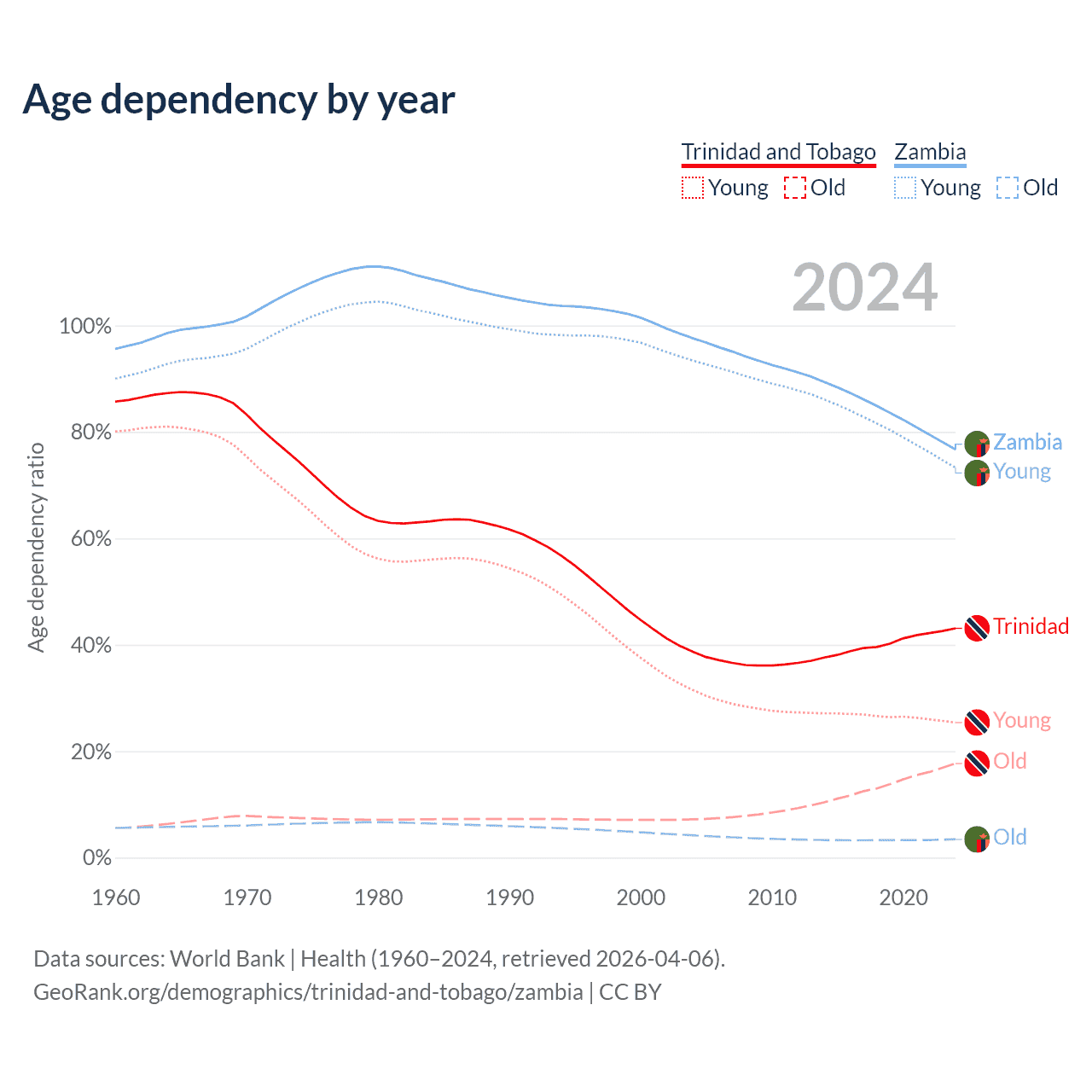 - Trinidad and Tobago is ranked 58/196 by median age (oldest to youngest) vs 182/196 for Zambia.