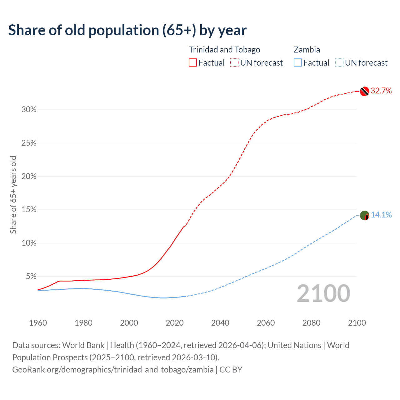The share of older people aged 65 and over is 12.4% in Trinidad and Tobago and 1.95% in Zambia. Life expectancy in Trinidad and Tobago compared to Zambia .