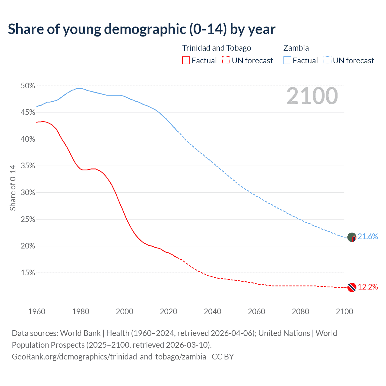 - The share of young demographic (0-15 years old) in Trinidad and Tobago is 17.8% vs 41.5% in Zambia.