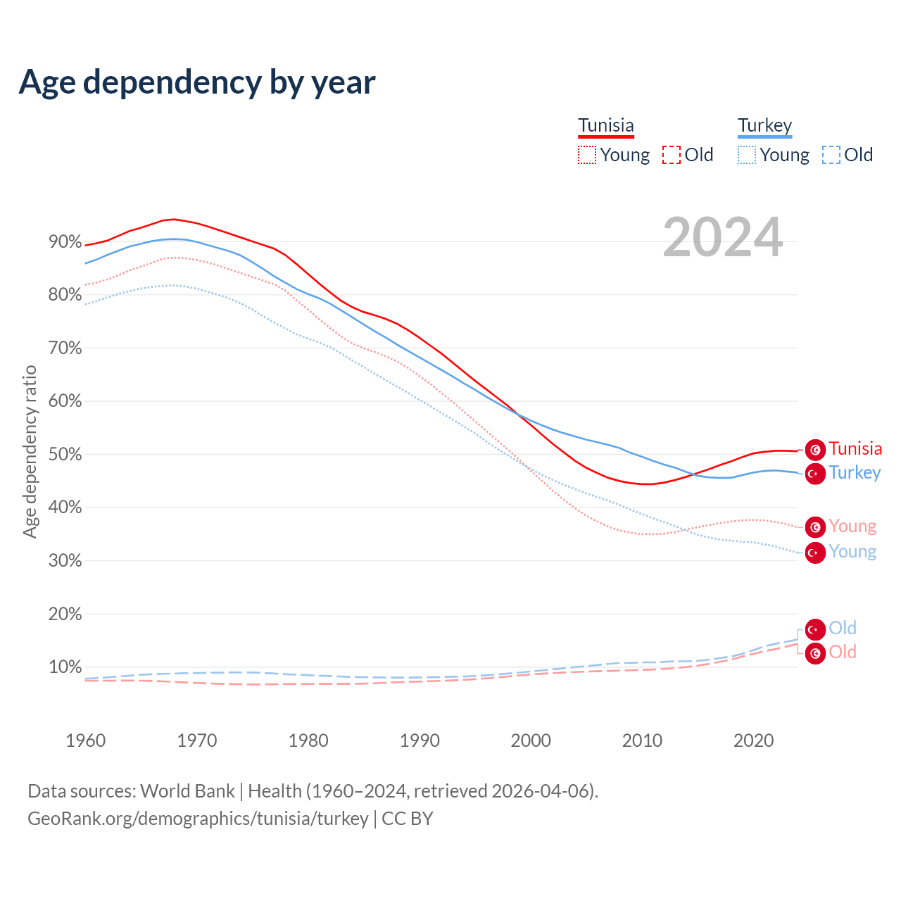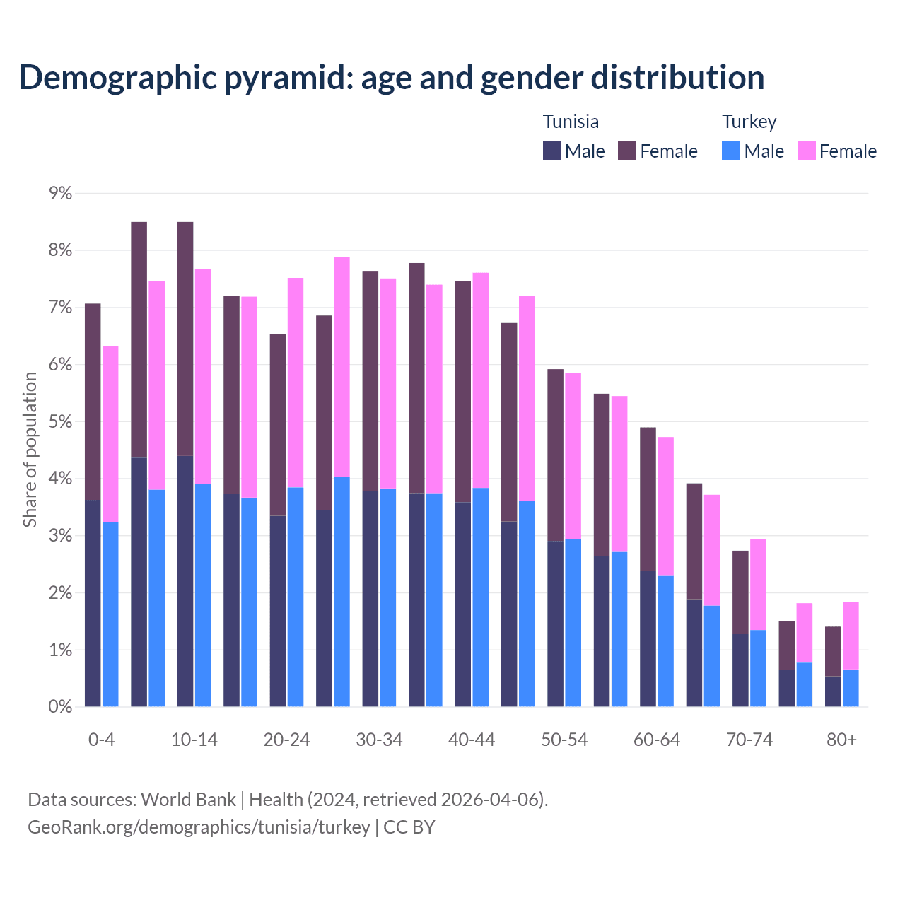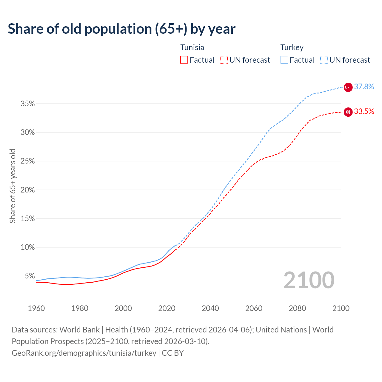 The share of older people aged 65 and over is 9.53% in Tunisia and 10.3% in Turkey. Life expectancy in Tunisia compared to Turkey .