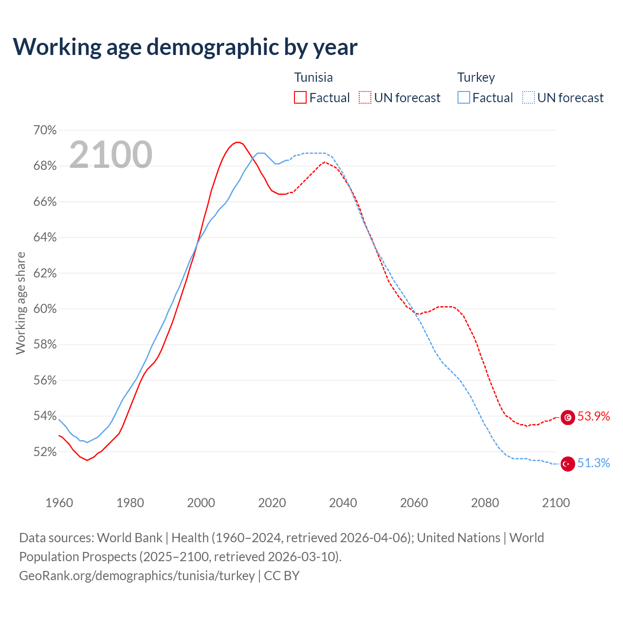 Median age Tunisia vs Turkey, 1960-2100