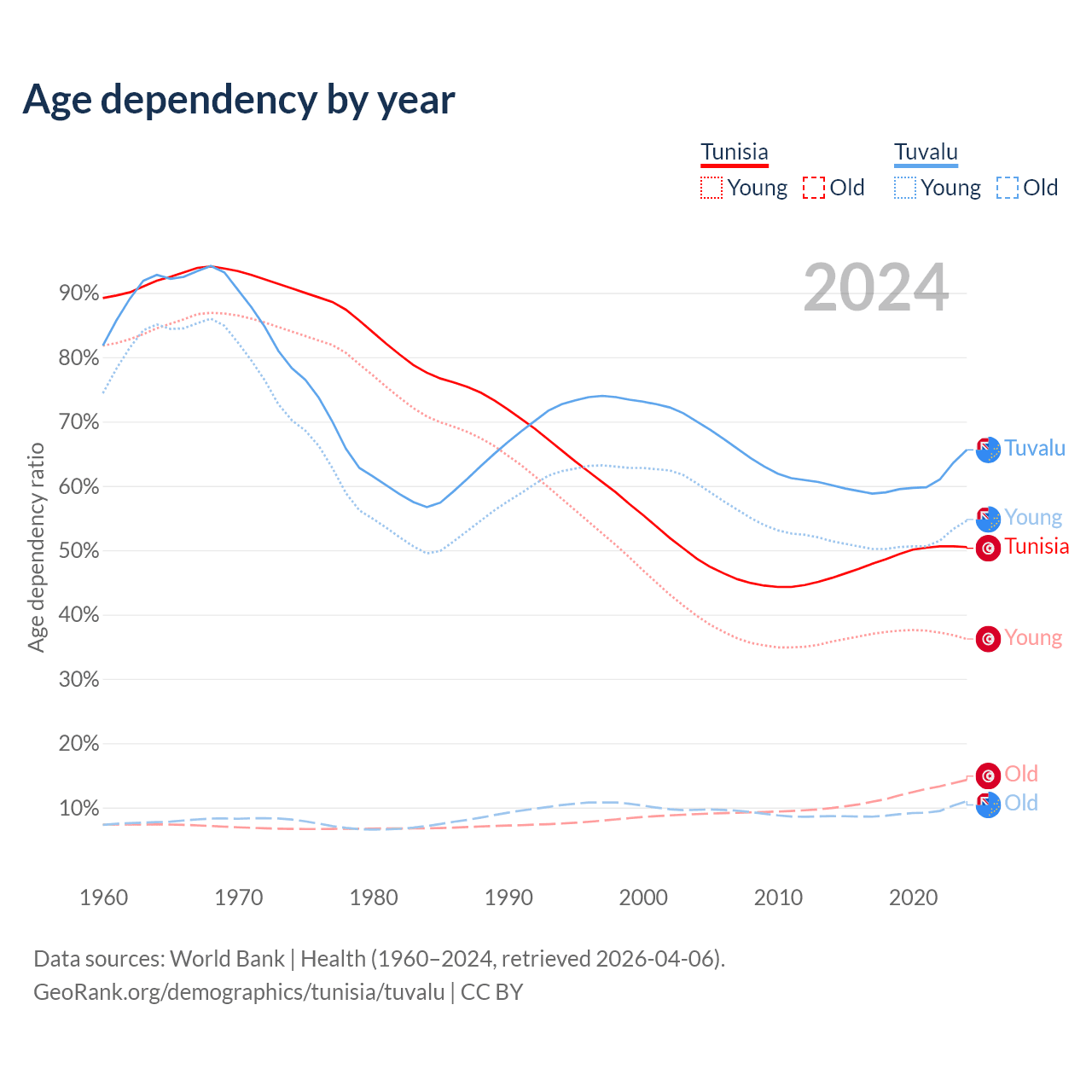 - The share of old-age demographic (65+) in Tunisia is 9.53% vs 6.67% in Tuvalu.