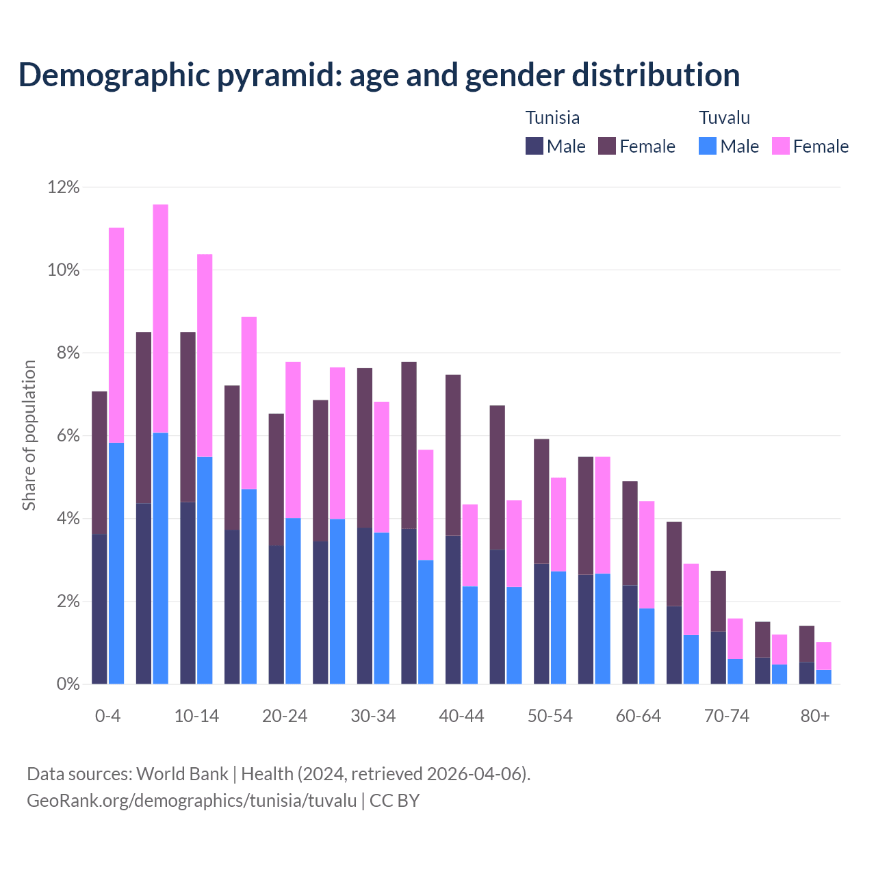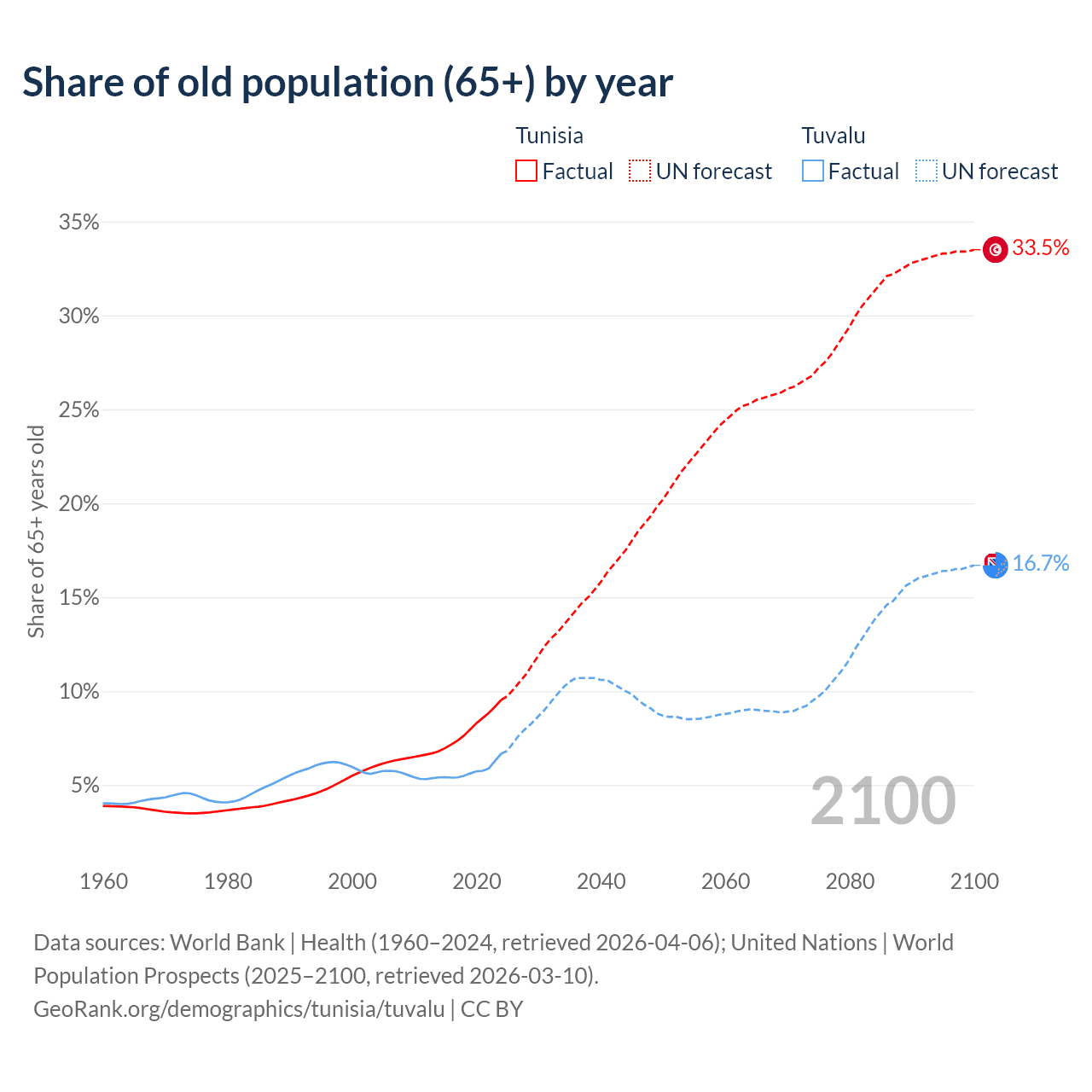 The share of older people aged 65 and over is 9.53% in Tunisia and 6.67% in Tuvalu. Life expectancy in Tunisia compared to Tuvalu .
