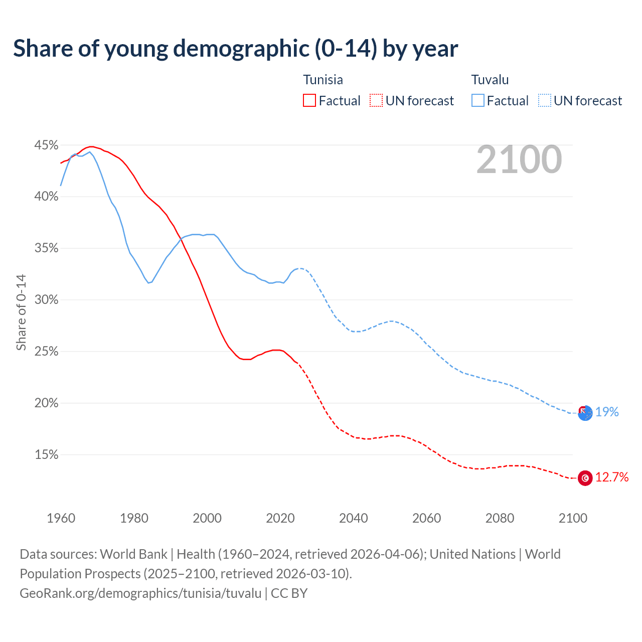 - The share of young demographic (0-15 years old) in Tunisia is 24% vs 32.9% in Tuvalu.