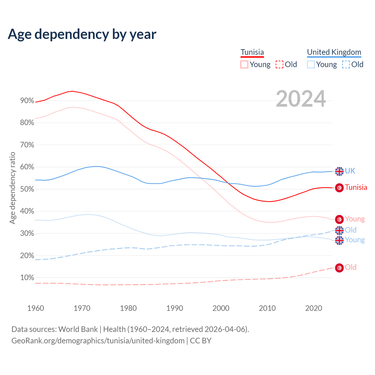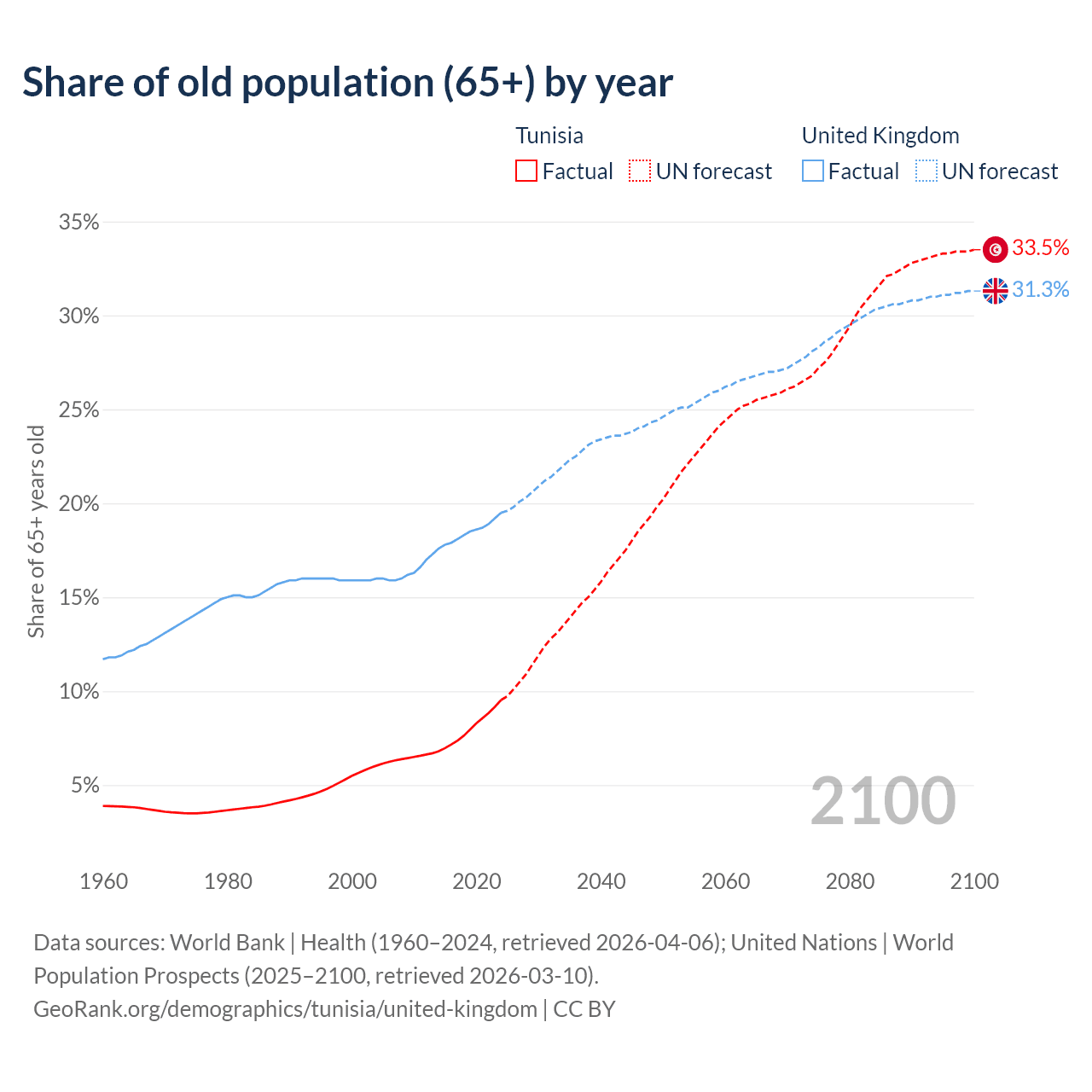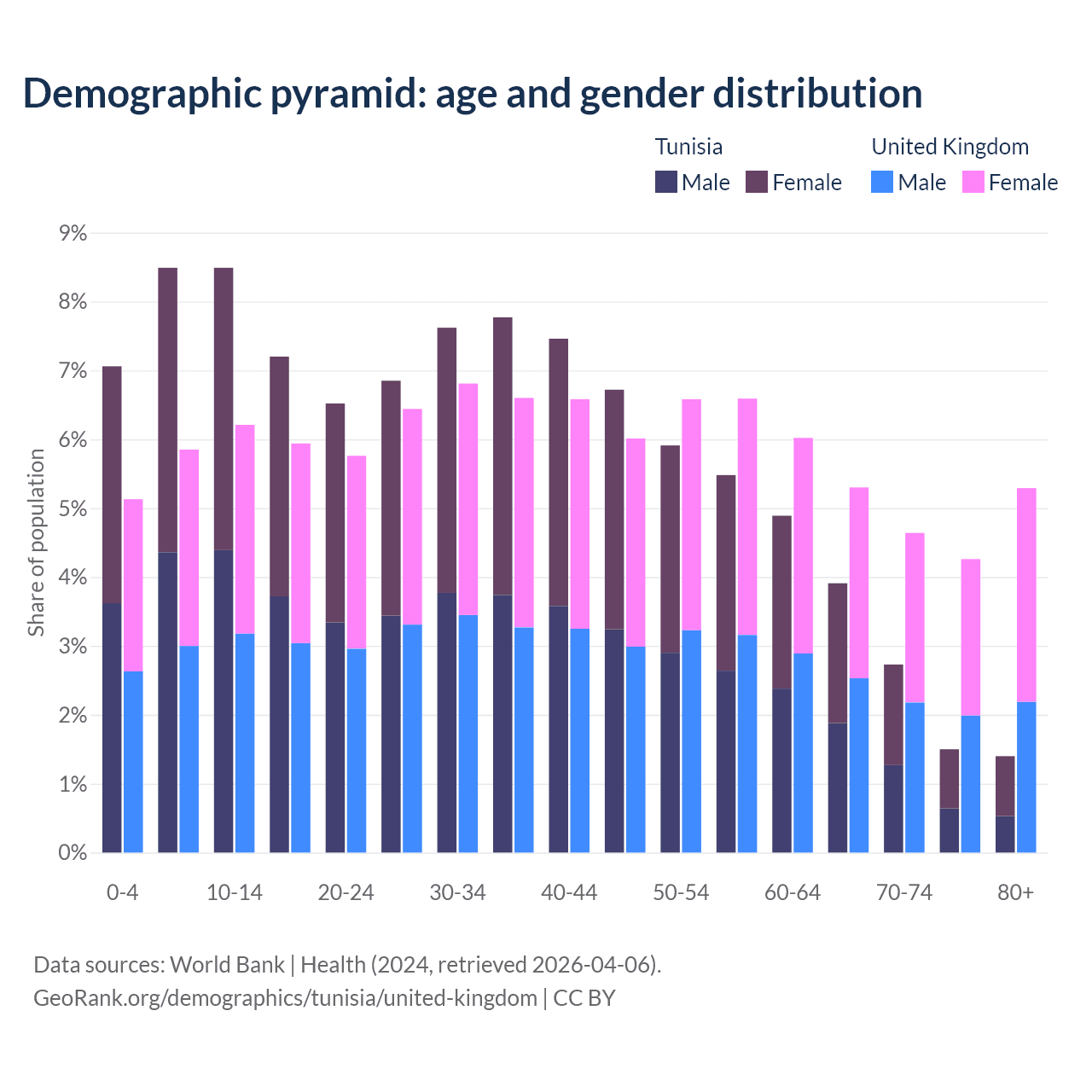 The share of older people aged 65 and over is 9.53% in Tunisia and 19.5% in the United Kingdom. Life expectancy in Tunisia compared to the United Kingdom .