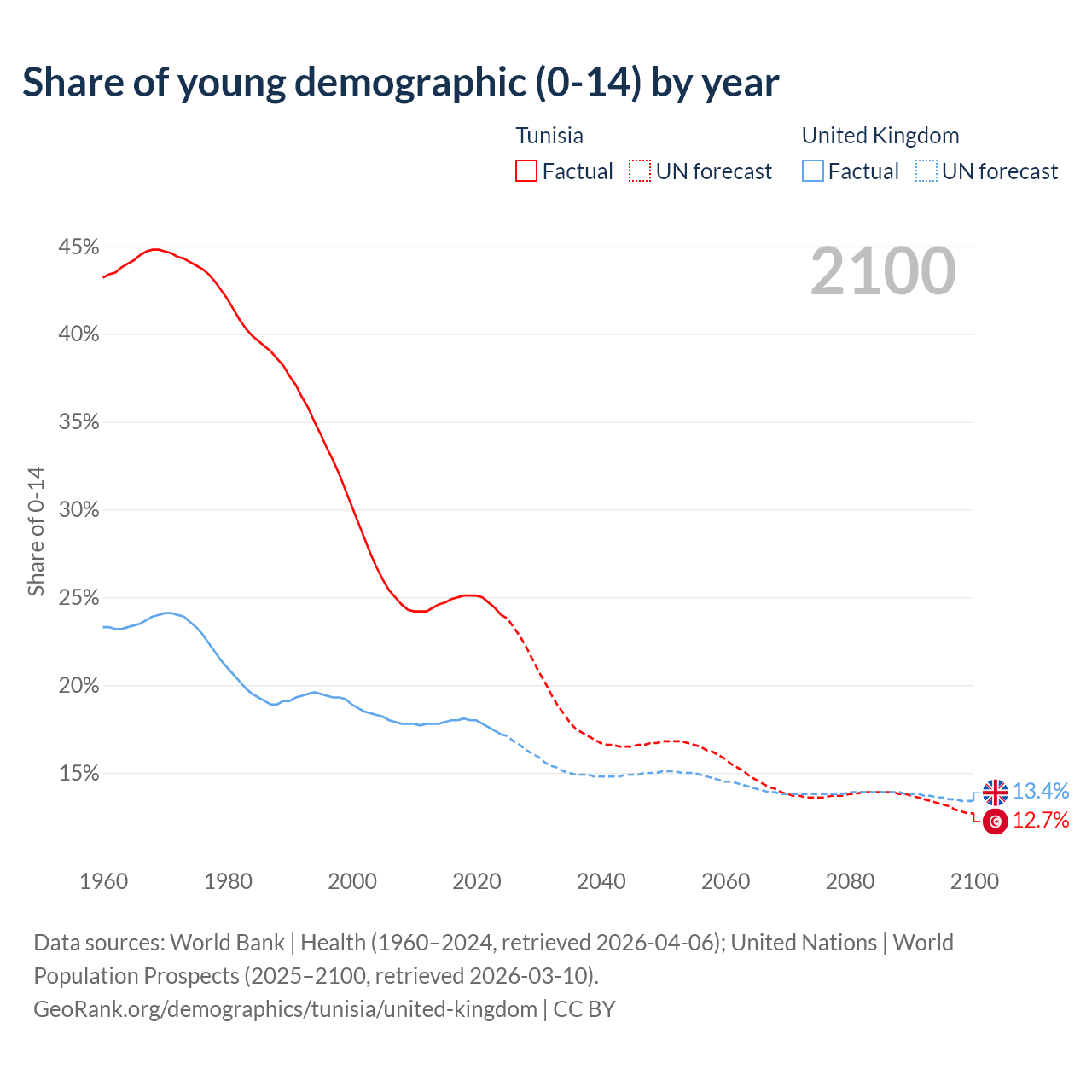 - The share of young demographic (0-15 years old) in Tunisia is 24% vs 17.2% in the United Kingdom.