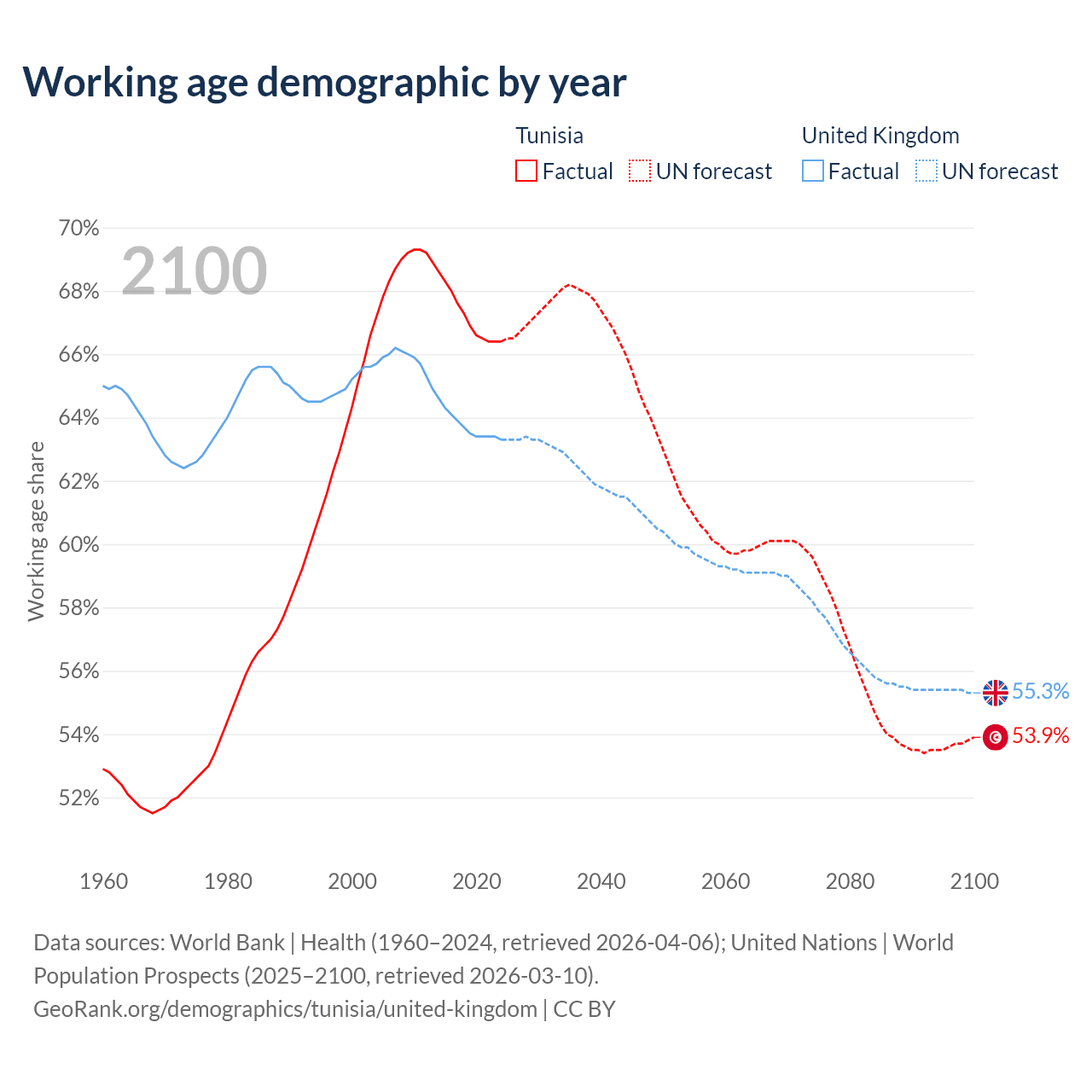 Median age Tunisia vs United Kingdom, 1960-2100
