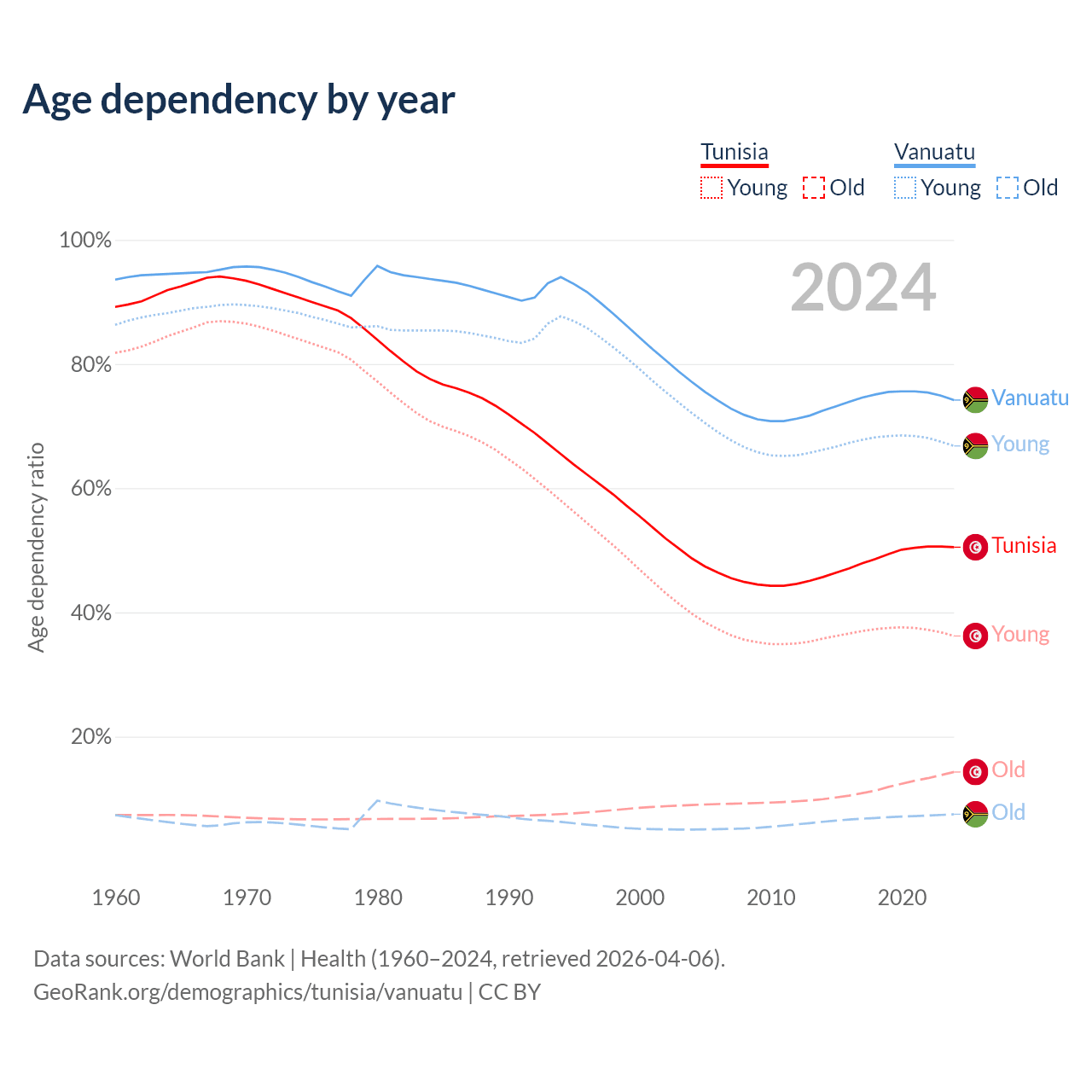 - Tunisia is ranked 86/196 by median age (oldest to youngest) vs 156/196 for Vanuatu.