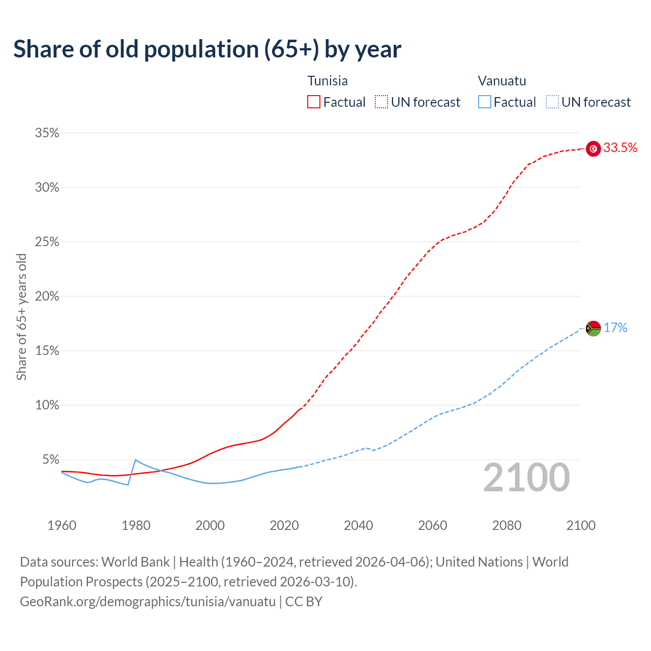 The share of older people aged 65 and over is 9.53% in Tunisia and 4.3% in Vanuatu. Life expectancy in Tunisia compared to Vanuatu .