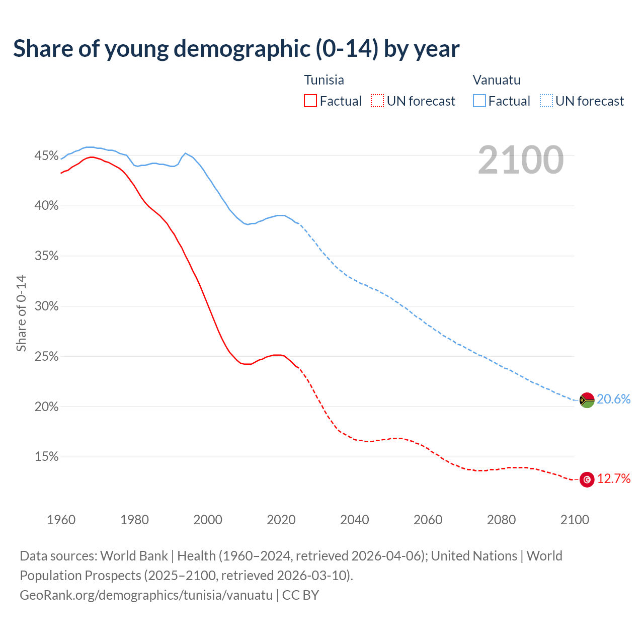 - The share of young demographic (0-15 years old) in Tunisia is 24% vs 38.3% in Vanuatu.