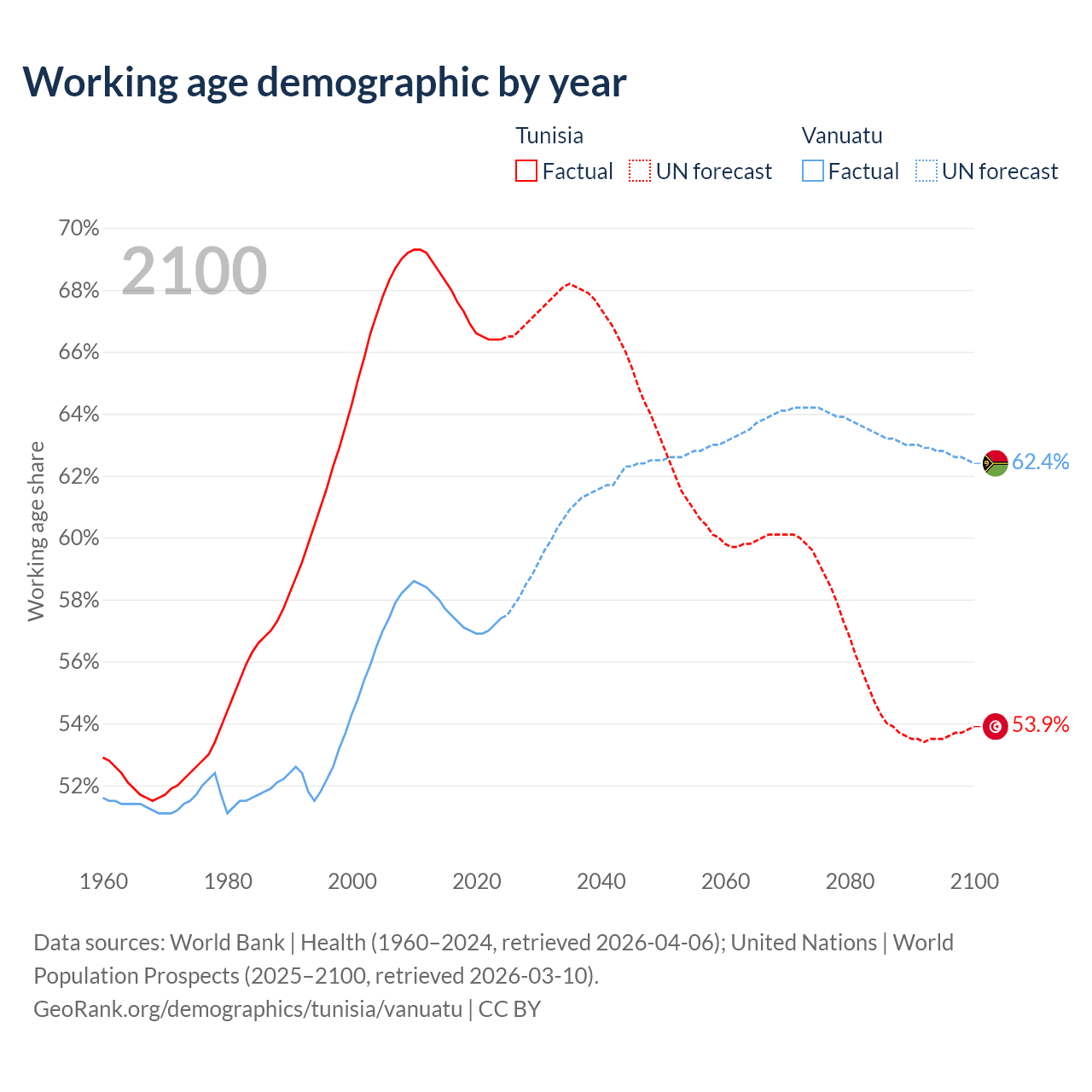 - Tunisia has 8.26M working age adults (aged 15-64) vs 198K in Vanuatu.