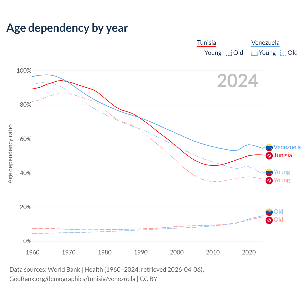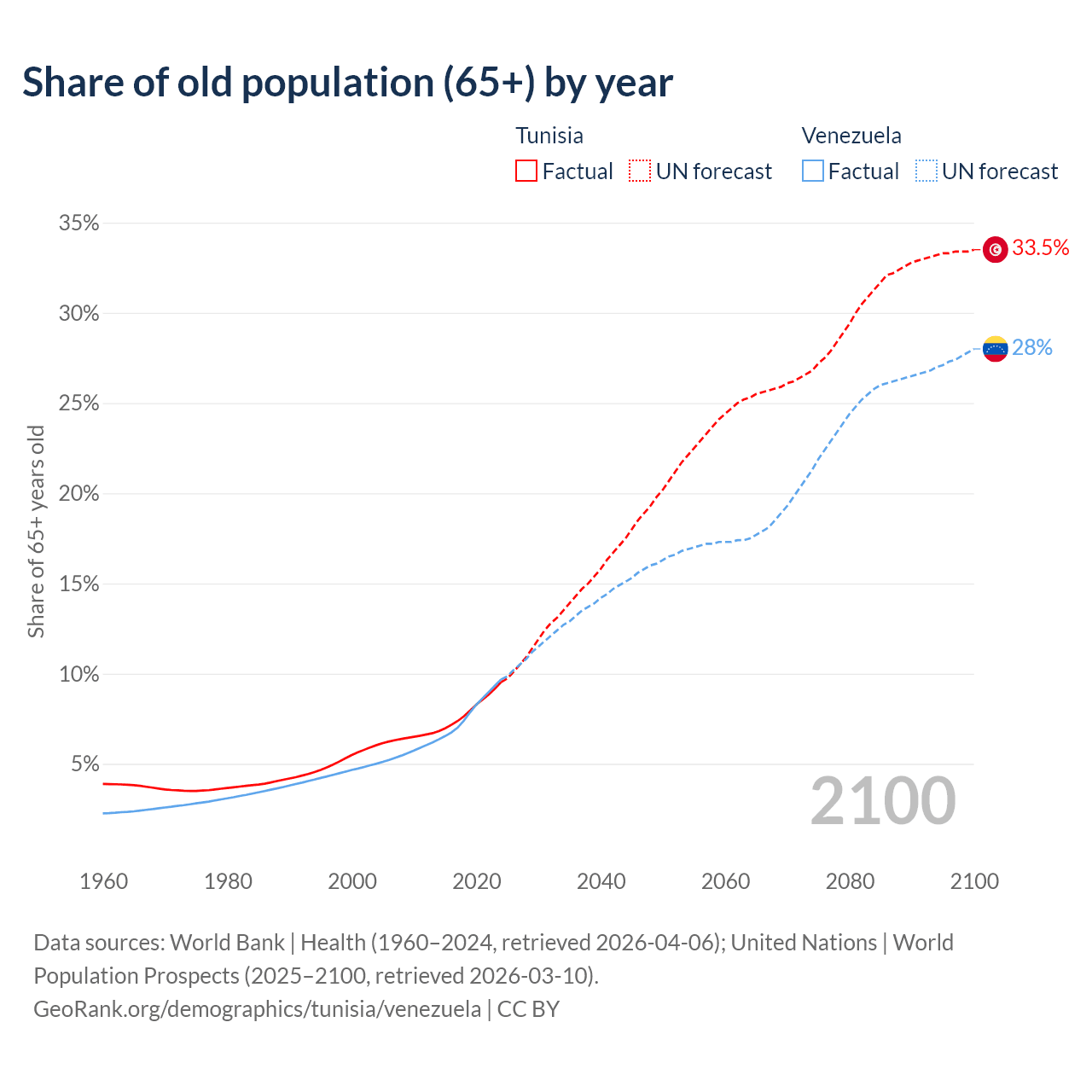 - The share of old-age demographic (65+) in Tunisia is 9.53% vs 9.68% in Venezuela.