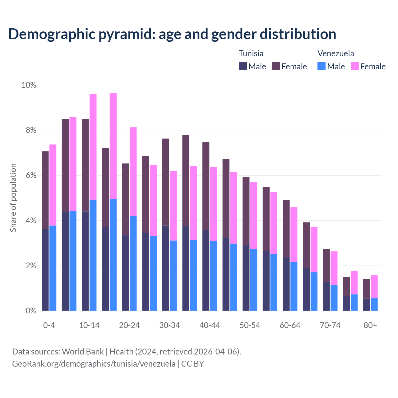 - The median age in Tunisia is 33.5 years compared to 30.2 years in Venezuela.