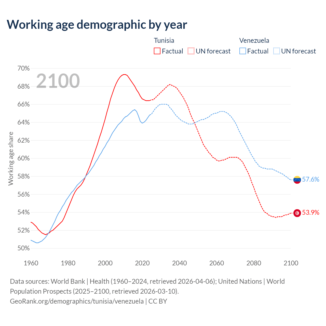 Median age Tunisia vs Venezuela, 1960-2100