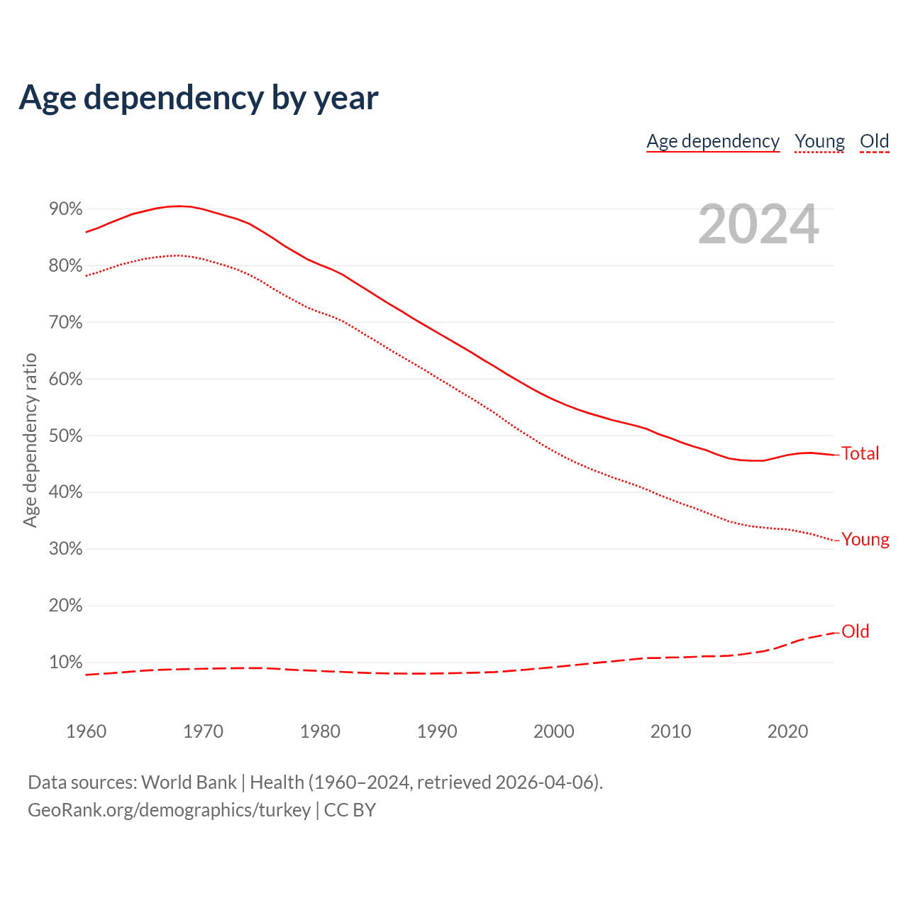 Data sources: World Bank | Health (1960–2024, retrieved 2026-04-06); U.S. Census Bureau (1960–2024, retrieved 2026-02-08).