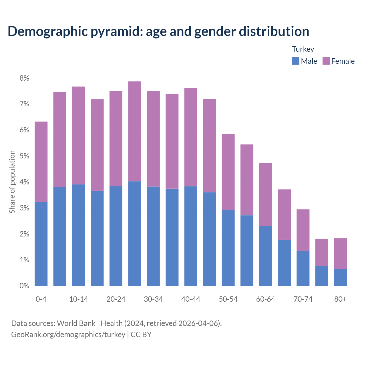 With a population of 85.5M people, Turkey has a median age of 34 years which makes it the 83/196 oldest country. 21.4% of the demographic are children 0-14 years old, 68.3% are working-age people aged 15-64, and 10.3% are older population aged 65+ years.