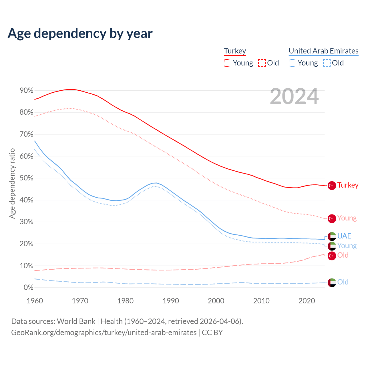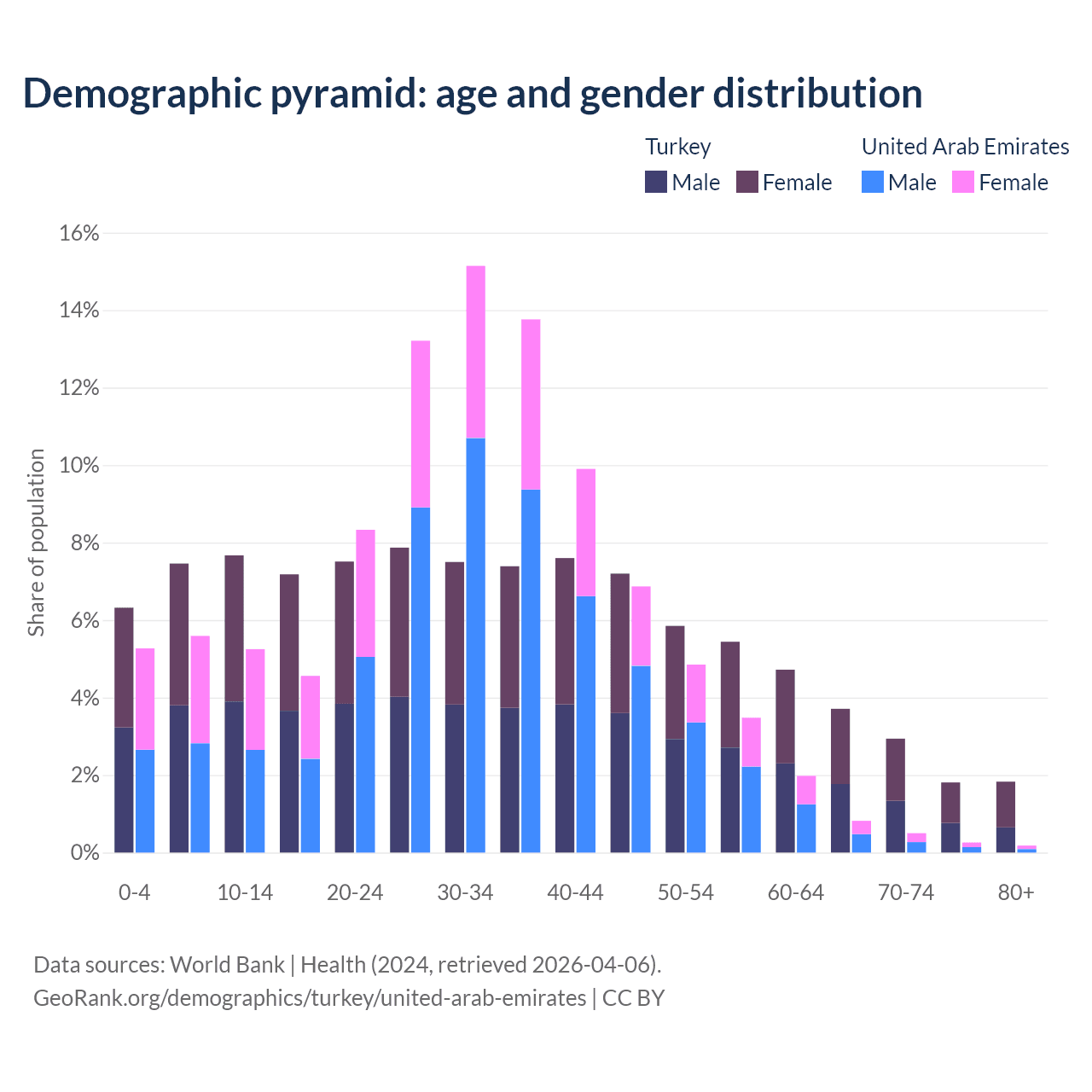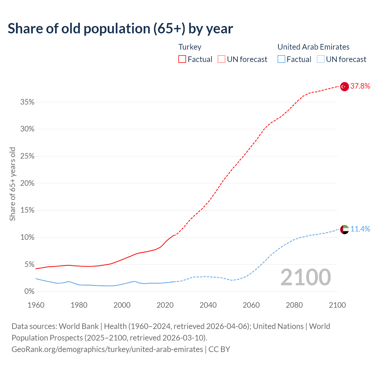 The share of older people aged 65 and over is 10.3% in Turkey and 1.77% in the United Arab Emirates. Life expectancy in Turkey compared to the United Arab Emirates .