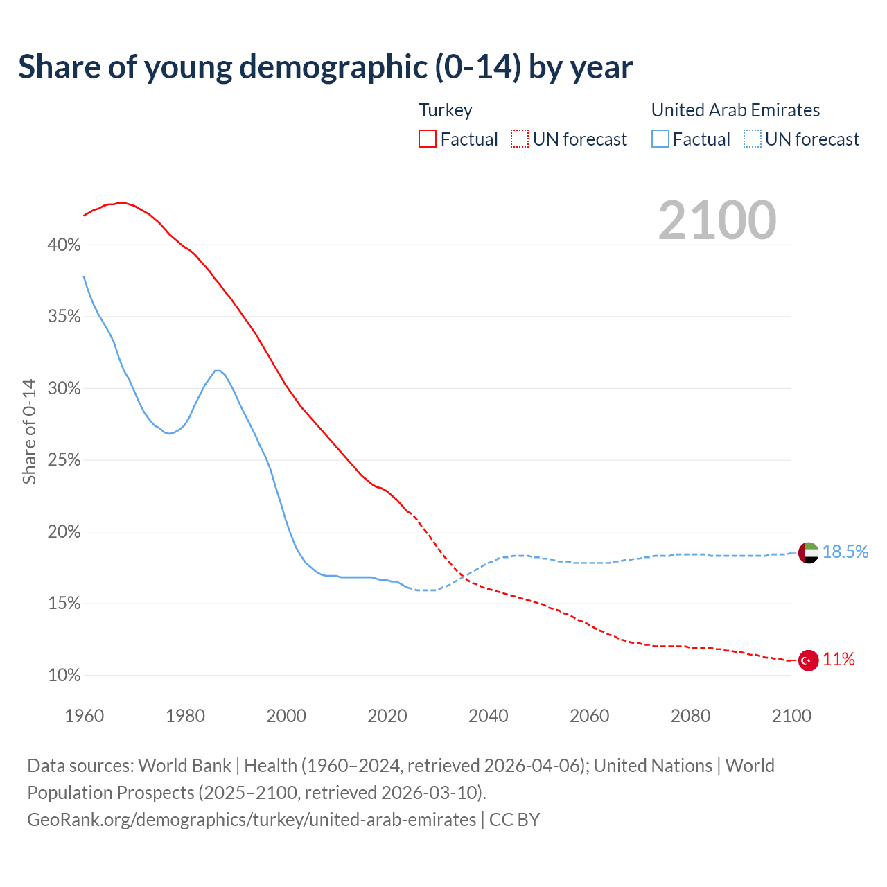 - The share of young demographic (0-15 years old) in Turkey is 21.4% vs 16.1% in the United Arab Emirates.
