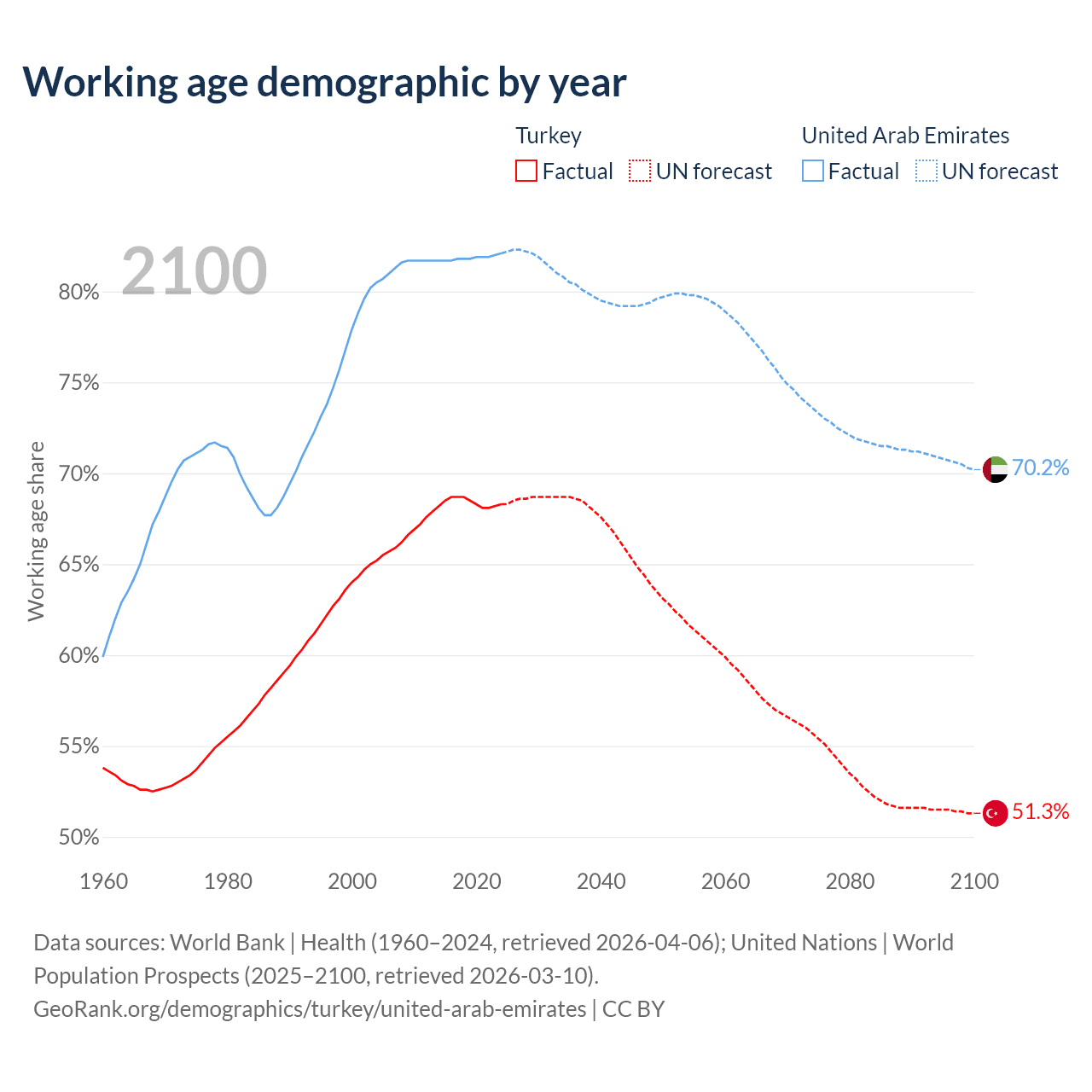 - Turkey has 58.7M working age adults (aged 15-64) vs 9.6M in the United Arab Emirates.