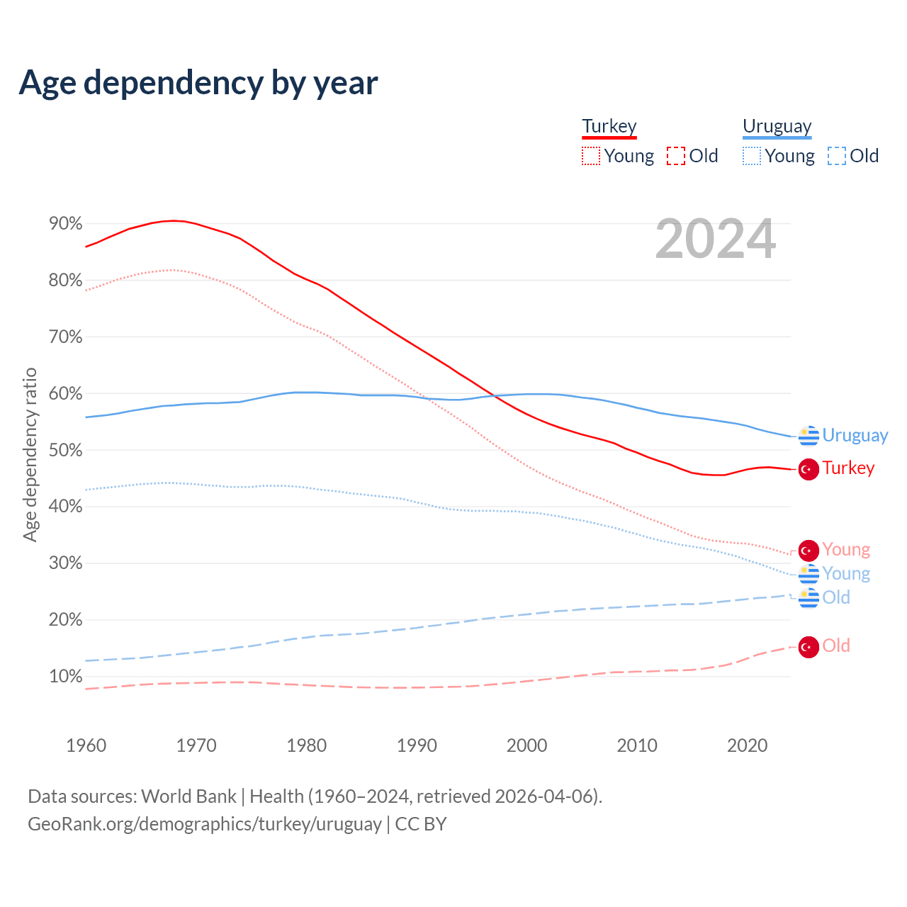 The share of older people aged 65 and over is 10.3% in Turkey and 16% in Uruguay. Life expectancy in Turkey compared to Uruguay .