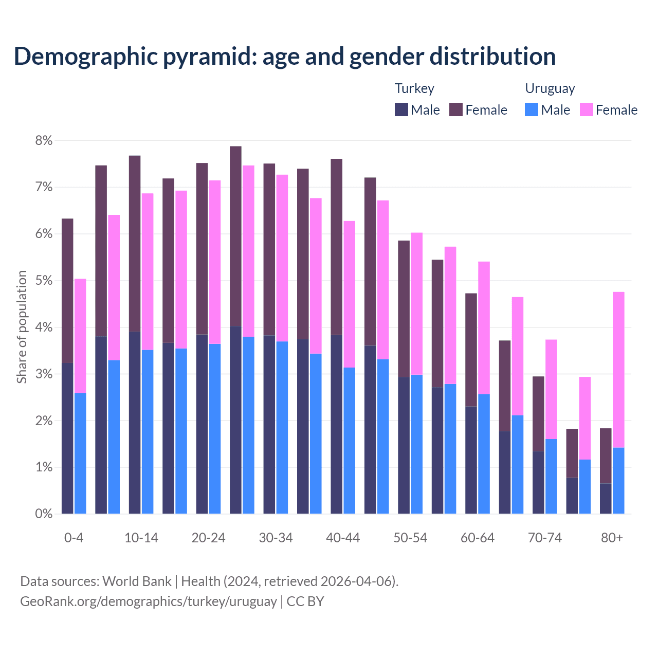- Turkey is ranked 83/196 by median age (oldest to youngest) vs 63/196 for Uruguay.