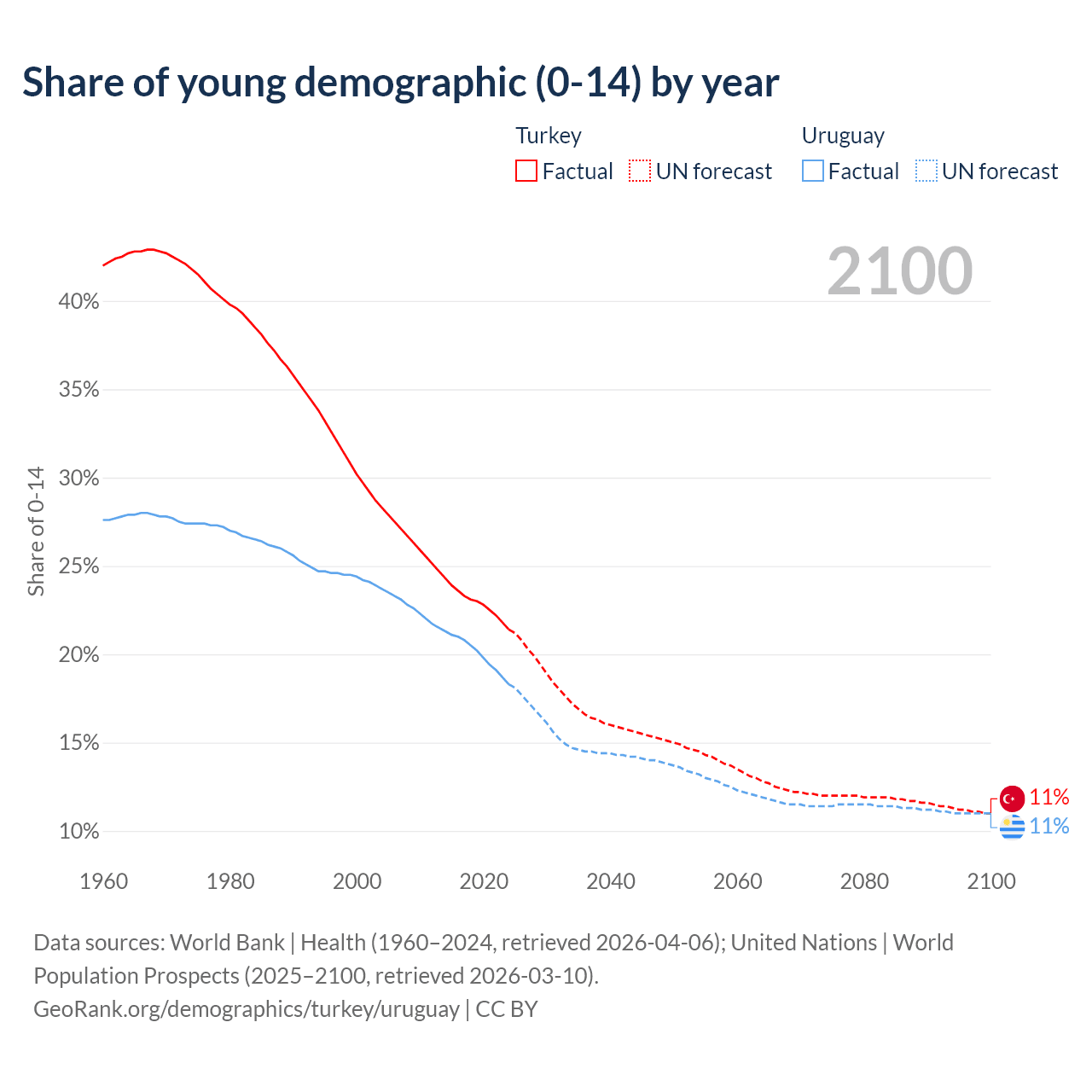 - The share of young demographic (0-15 years old) in Turkey is 21.4% vs 18.3% in Uruguay.